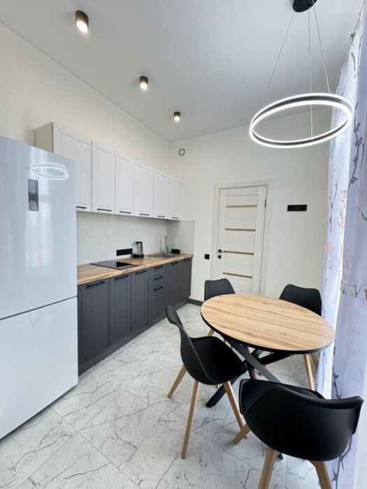 Техника на кухне: большой холодильник, индукционная плита, электро чайник, микроволновая печь.