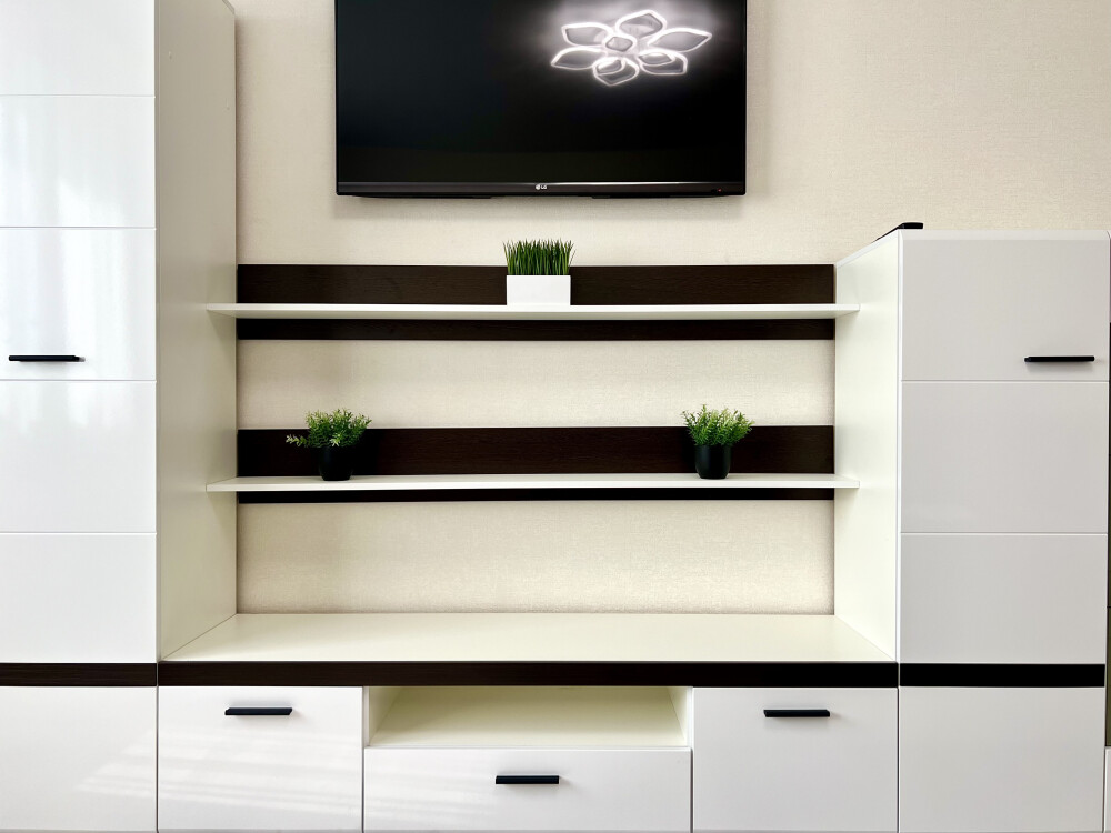 - интернет и тв для Вашей работы и отдыха, подключен большой пакет каналов для телевизоров , телевизор Samsung со Smart ТВ (диагональ 50 см) в спальне, телевизор BBK (диагональ 32) с приставкой на кухне.