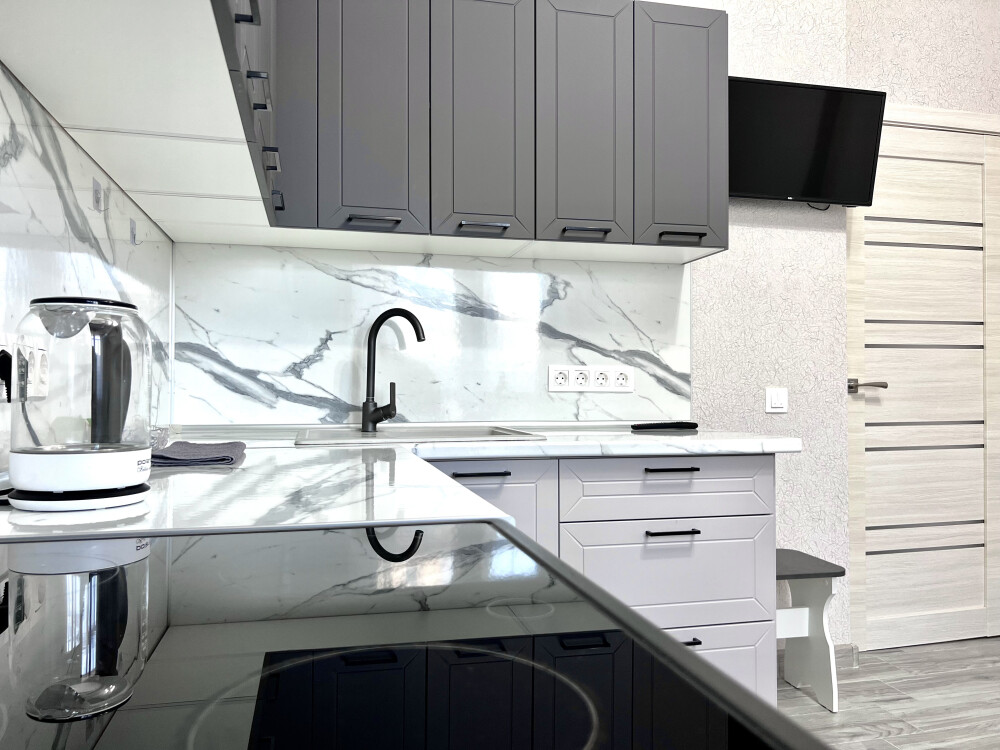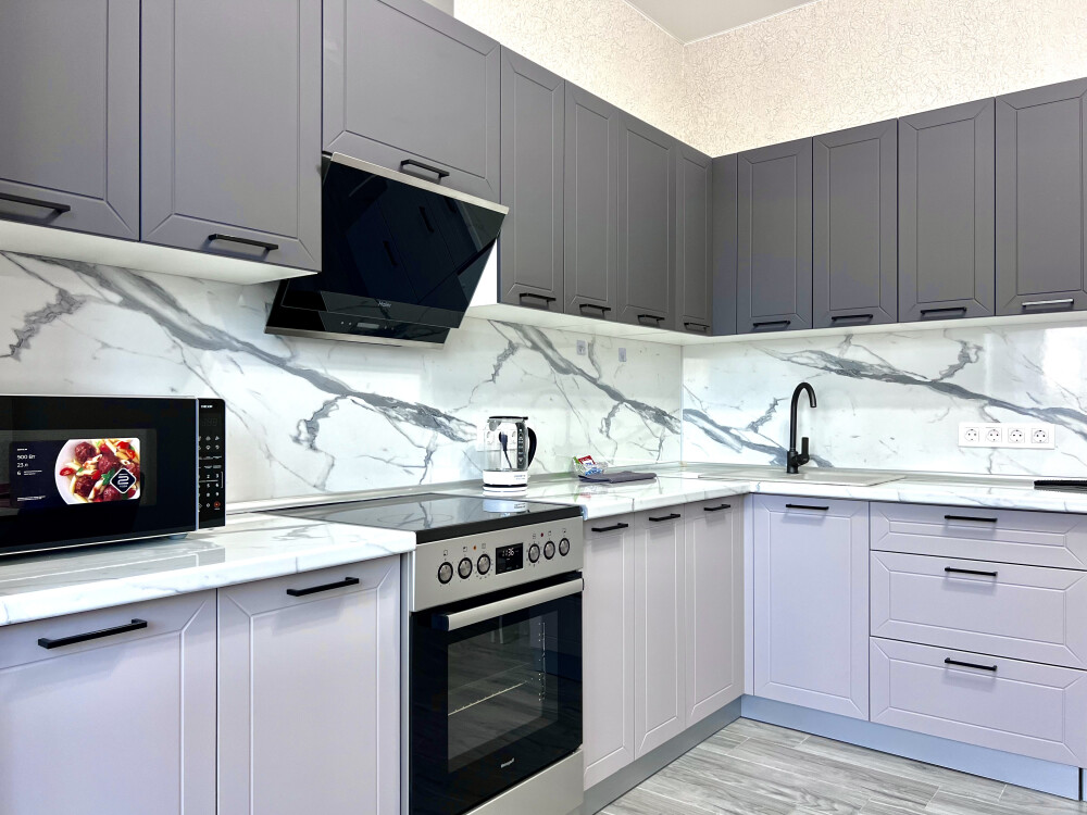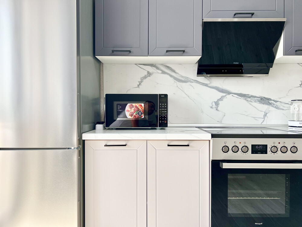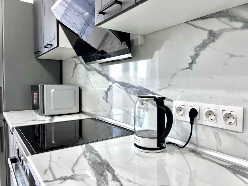 - наши гости могут готовить на полностью оборудованной кухне с бытовой техникой и посудой. Есть плита, духовой шкаф (духовка), вытяжка, электрический чайник, холодильник, микроволновая печь, мультиварка;