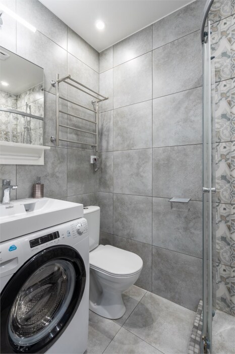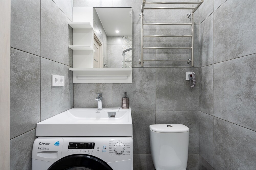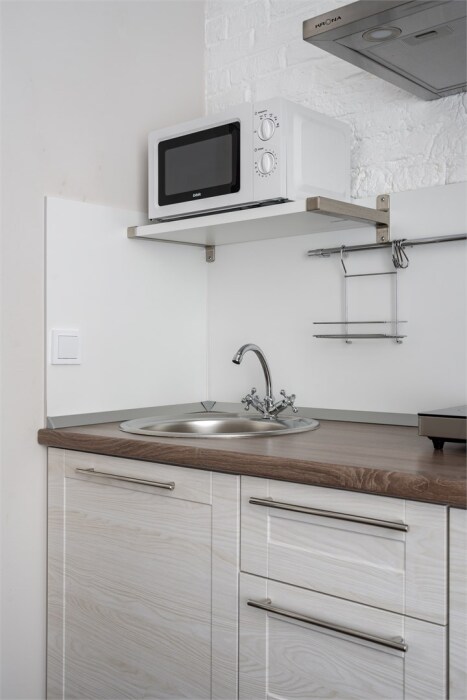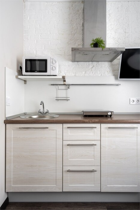 - Полноценная кухонная зона с электрической плиткой, микроволновой печью, холодильником и раковиной.