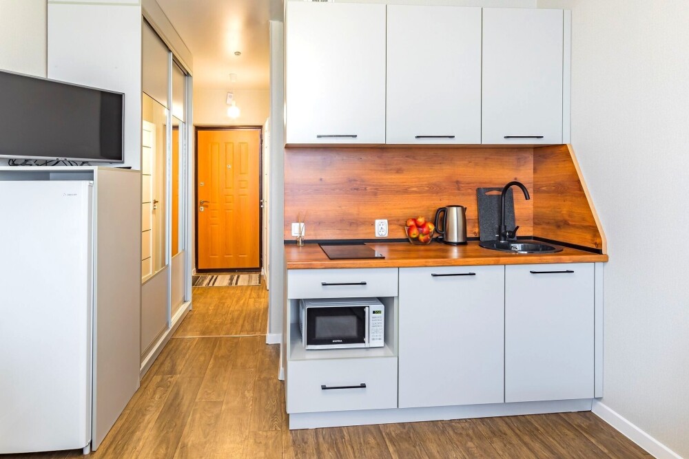 - полностью оборудованная кухня (холодильник, плита, СВЧ-печь, чайник, набор посуды);