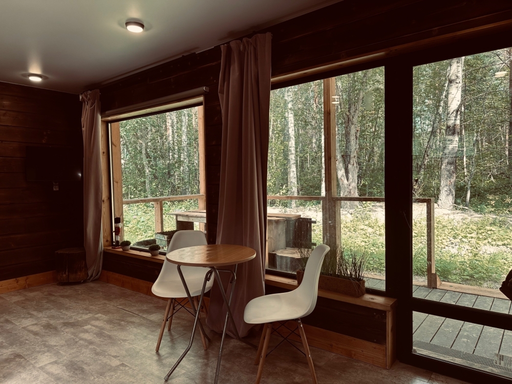 Дом выполнен из экологически чистого карельского материала, вся отделка из природных материалов. В нашем доме дышится гораздо легче, а шум леса и пение птиц помогает восстановиться после городской суеты. Хоть мы и находимся в лесу, у нас прекрасно ловит LТЕ. Уютный дом с панорамными окнами на всю стену с видом на лес и окнами в пол, вместимостью до 5 взрослых человек.