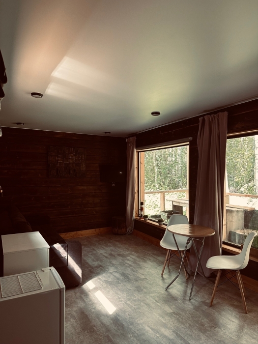 - гостиная-кухня с большим двуспальным диваном 160/200 и панорамными окнами с видом на Карельский лес, комод для личных вещей;