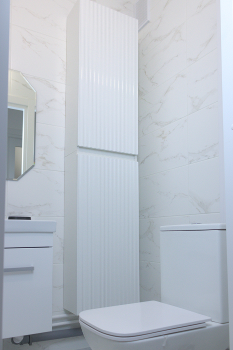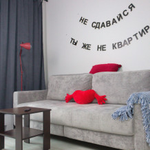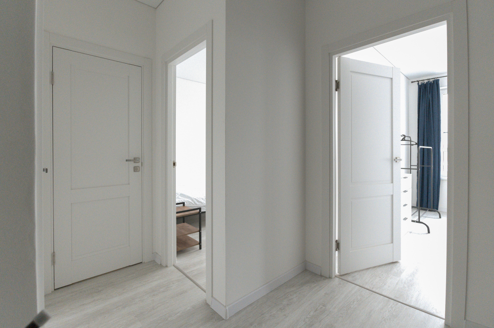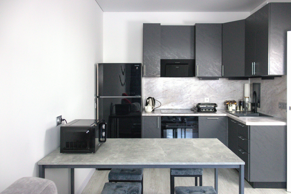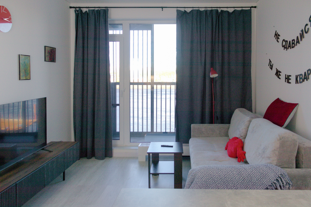 Интерьер выполнен в спокойных светлых тонах с акцентами в стиле минимализм, что создаёт атмосферу уюта и комфорта. В апартаментах могут разместиться до 6 гостей.