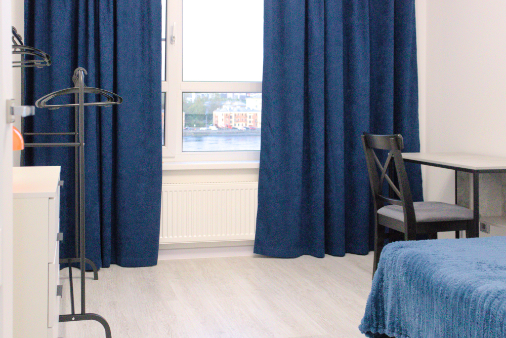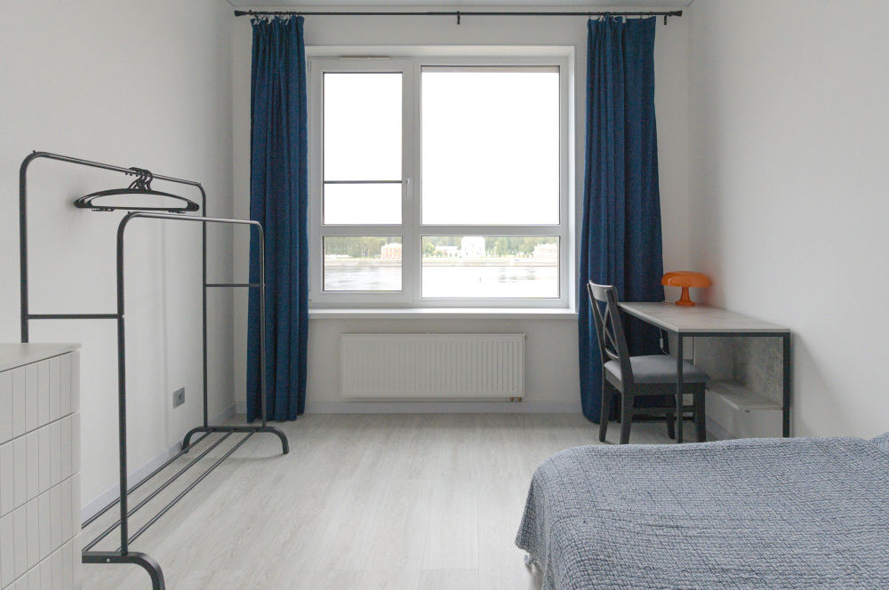 Для отдыха предусмотрены две отдельных спален с двуспальной кроватью и рабочим местом у окна с видом на набережную.