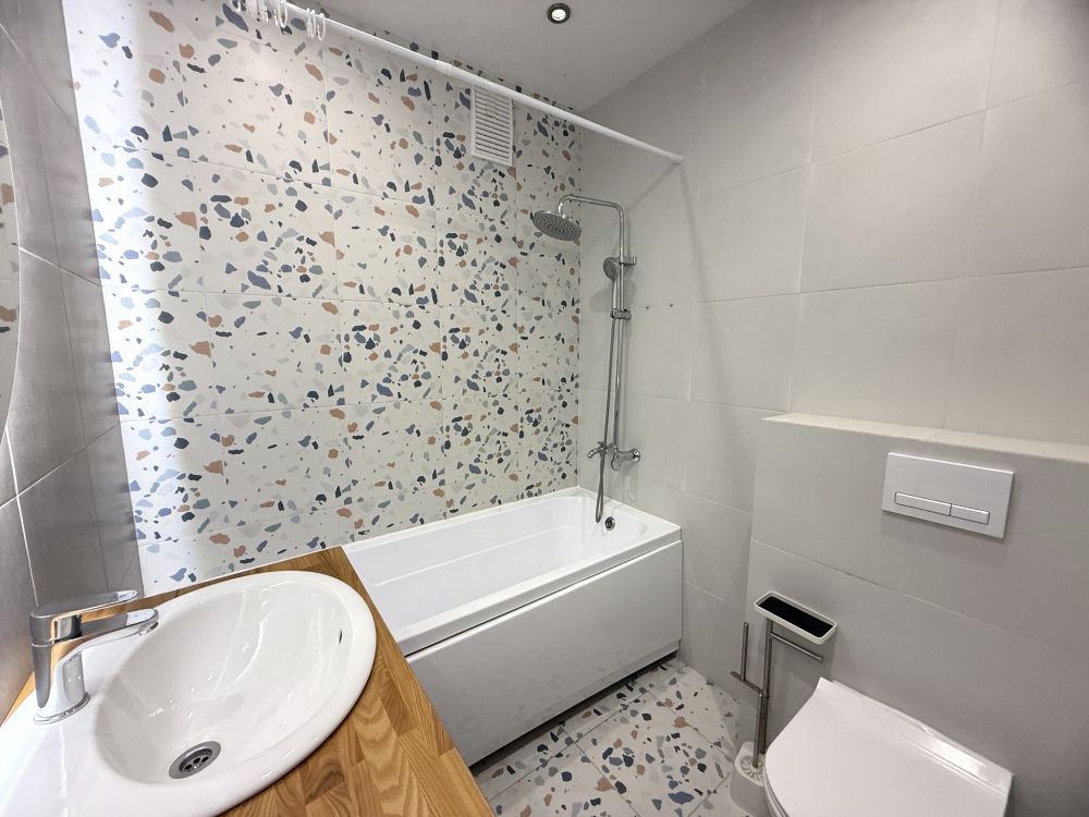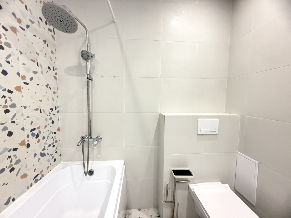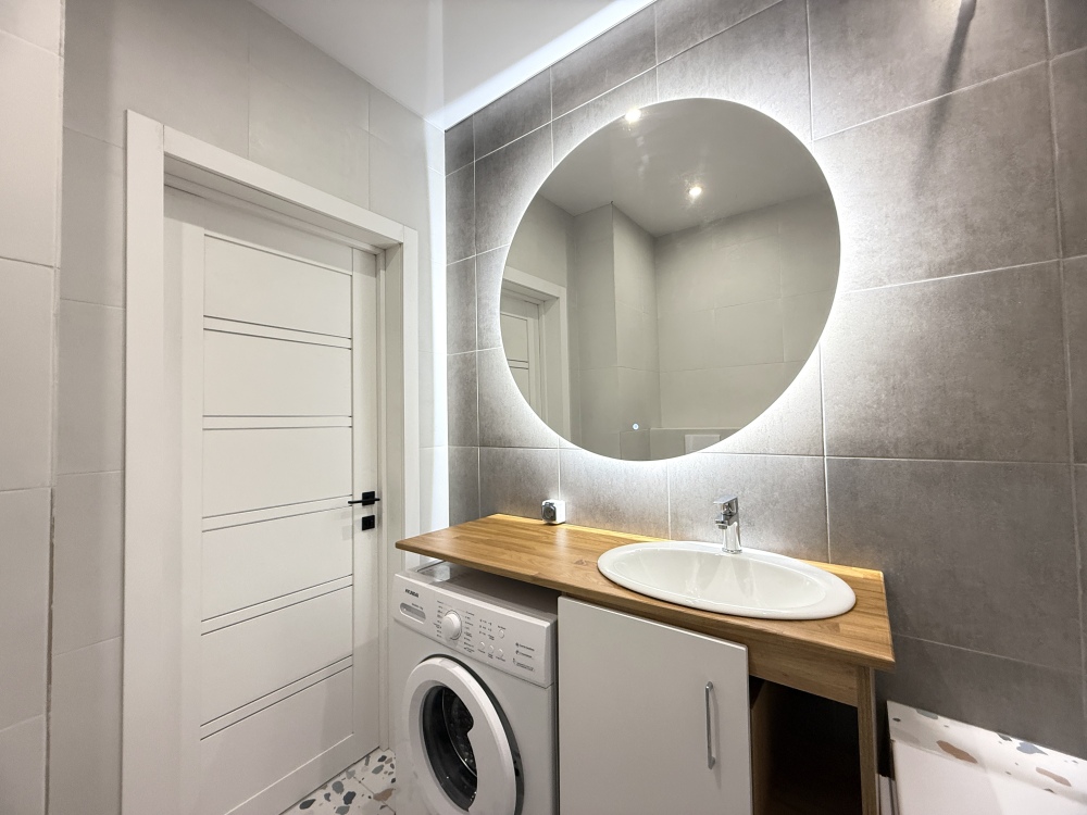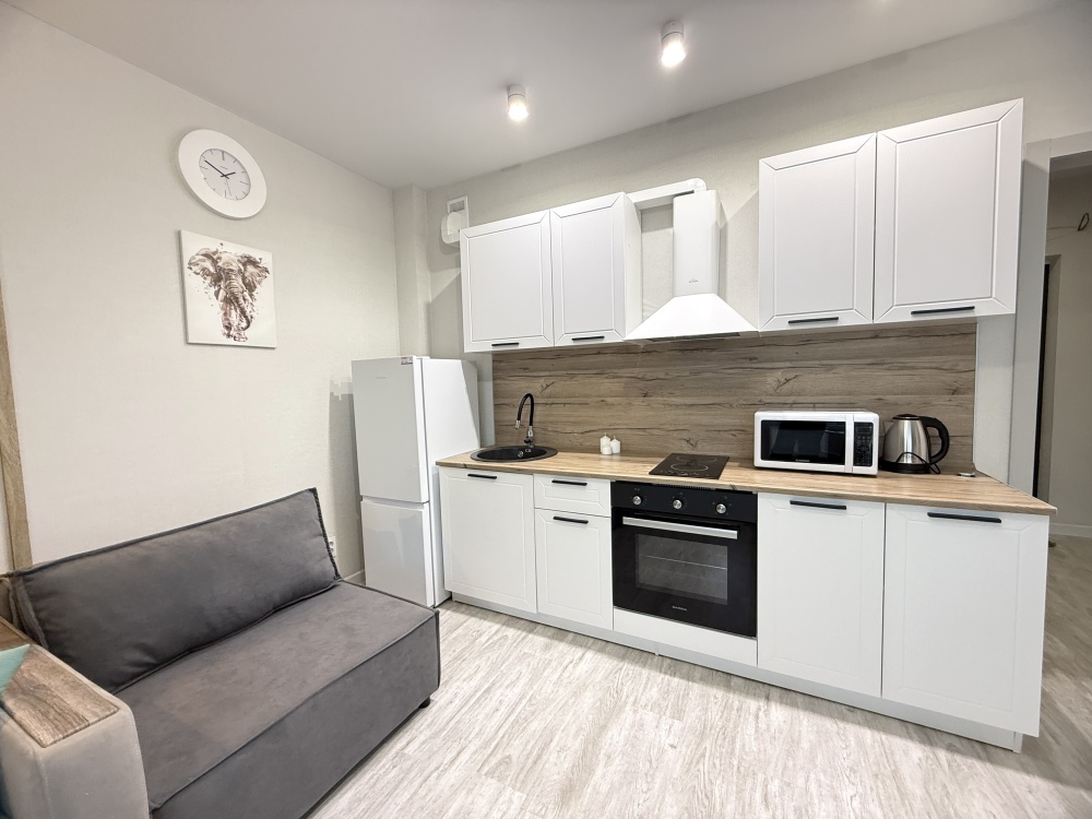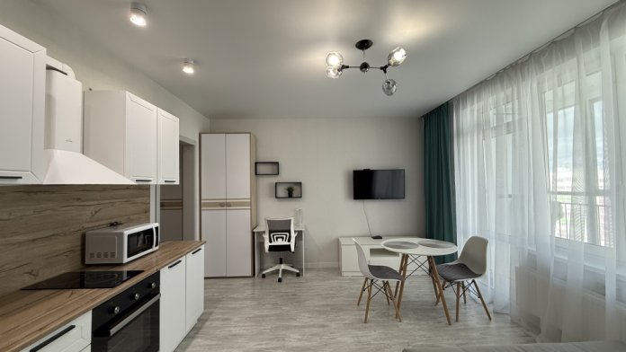 - современная бытовая техника: варочная панель, двухкамерный холодильник, вытяжка, электрочайник, СВЧ, фен, утюг, стиральная машина.