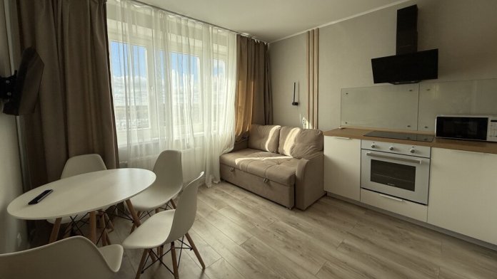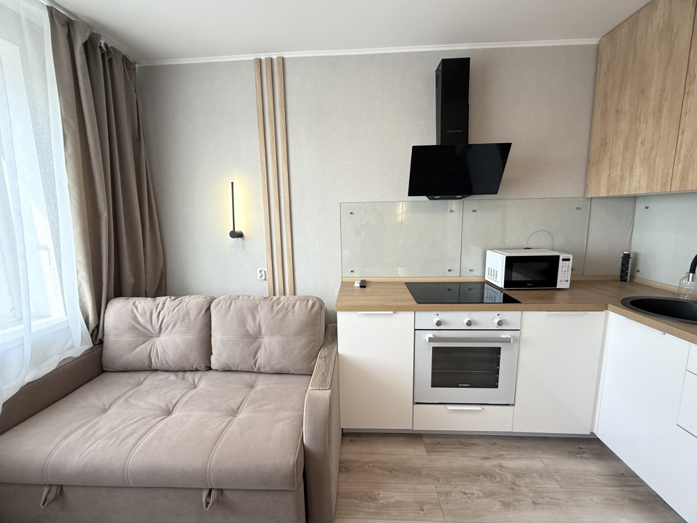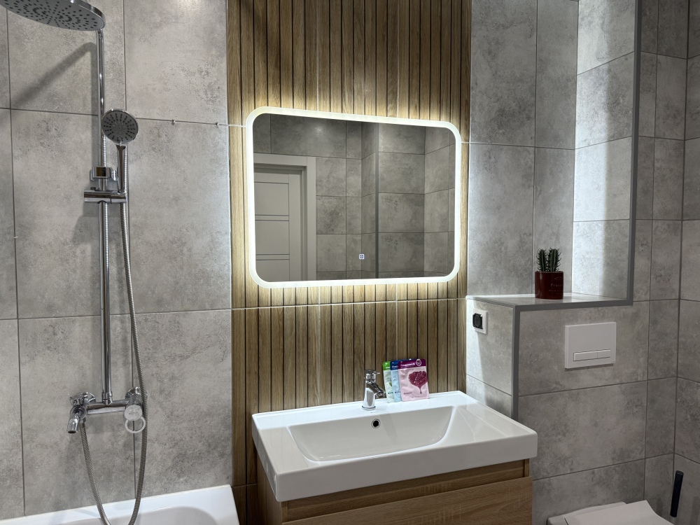 - современная бытовая техника: варочная панель, двухкамерный холодильник, вытяжка, электрочайник, СВЧ, фен, утюг, стиральная машина.