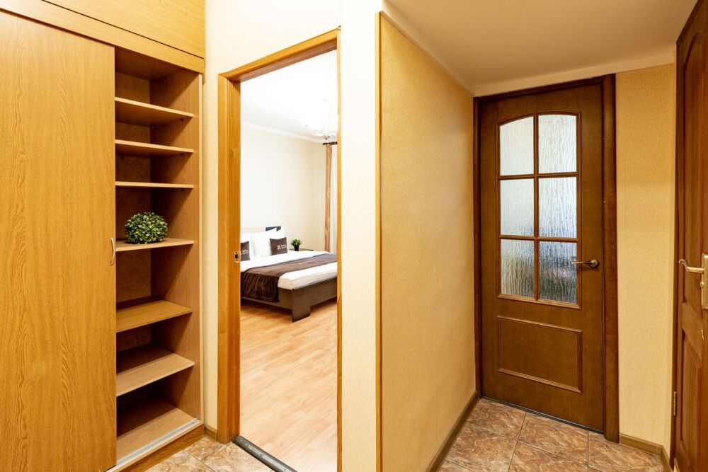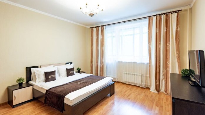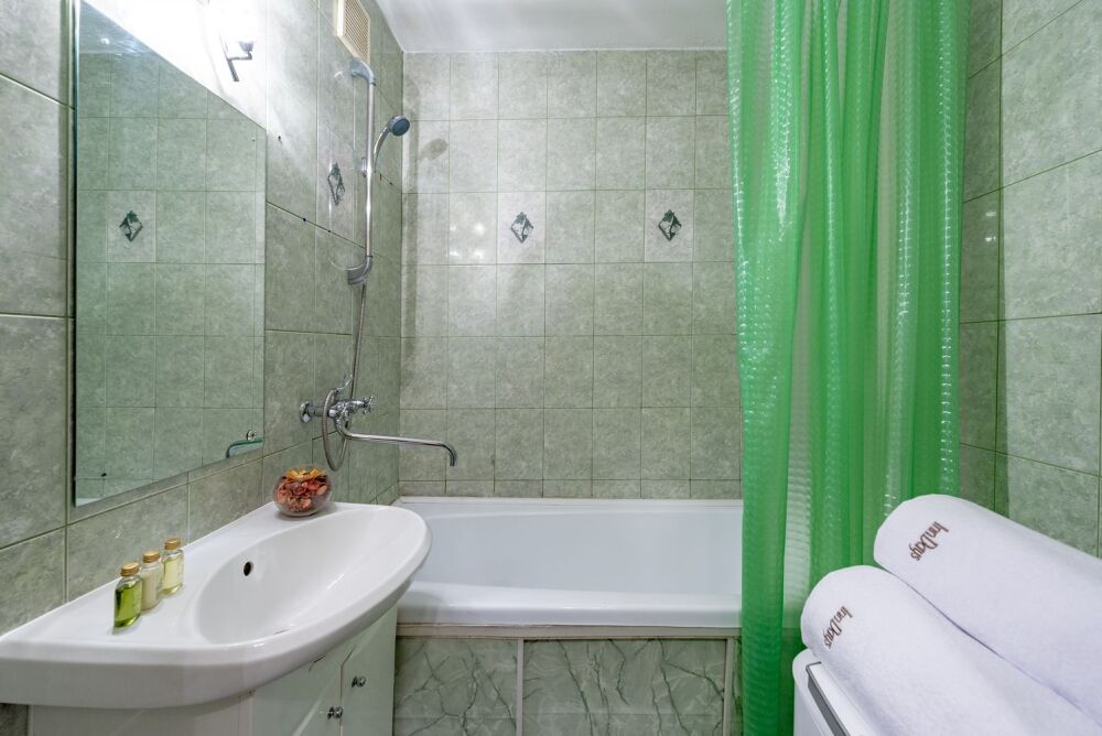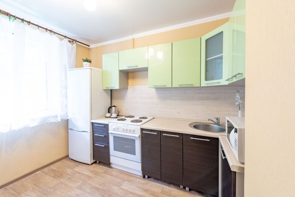 В большой, светлой комнате находятся двуспальная кровать, раздвижной диван, комод, телевизор. Кухня оборудована всем необходимым для приготовления вкусных обедов. В квартире имеется вся необходимая бытовая техника: ЖК-телевизор, холодильник, стиральная машина, электрический чайник, СВЧ, фен, утюг, гладильная доска, на кухне вся необходимая посуда. Для приятного времяпрепровождения к вашим услугам безлимитный интернет Wi-Fi и кабельное TV.