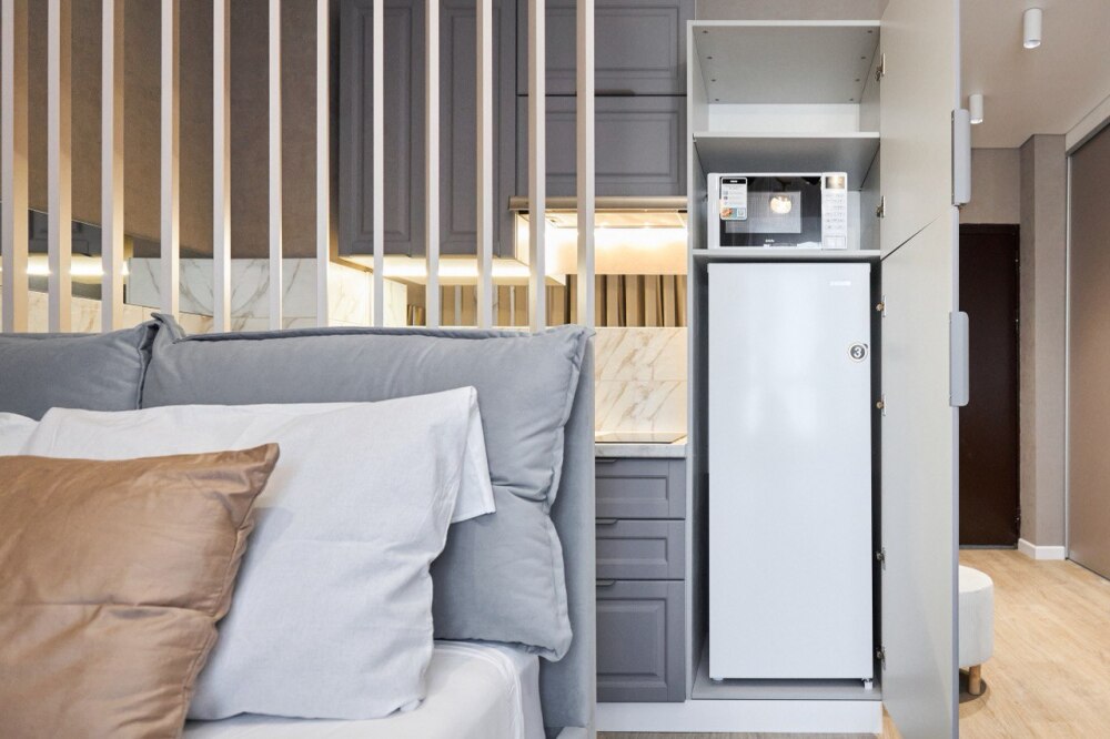 - Оборудованная кухня (холодильник, микроволновая печь, варочная панель, чайник);