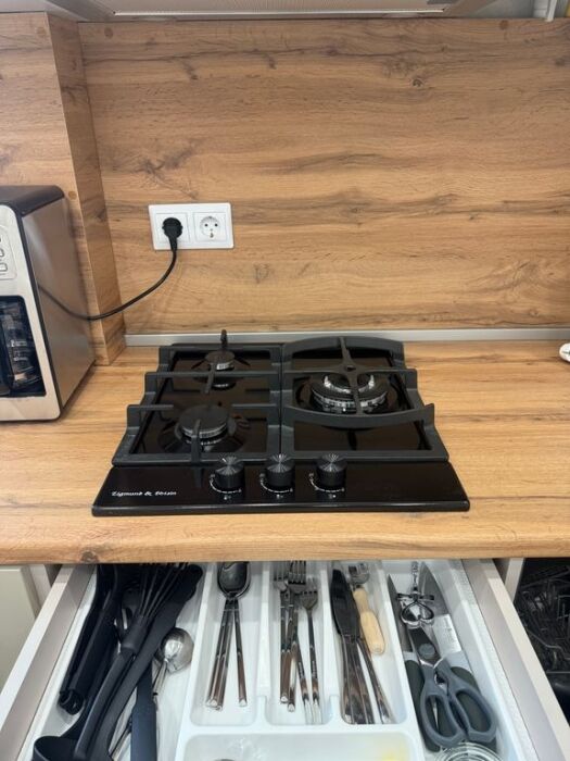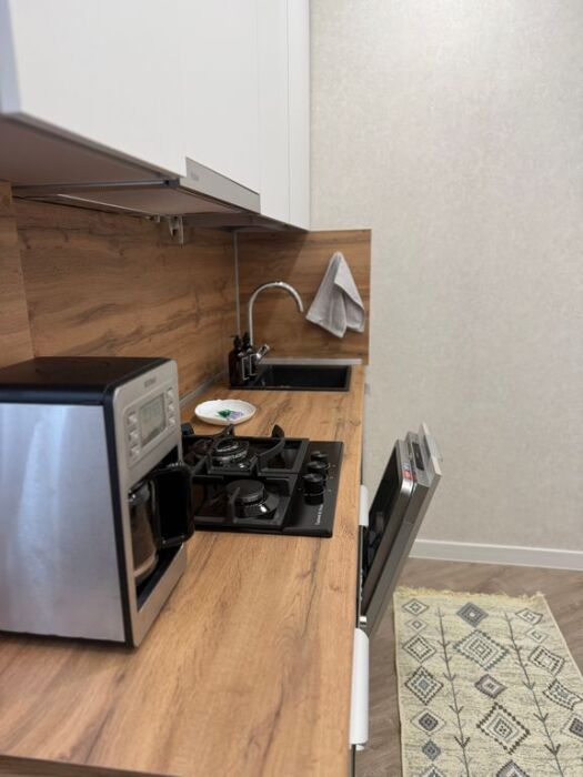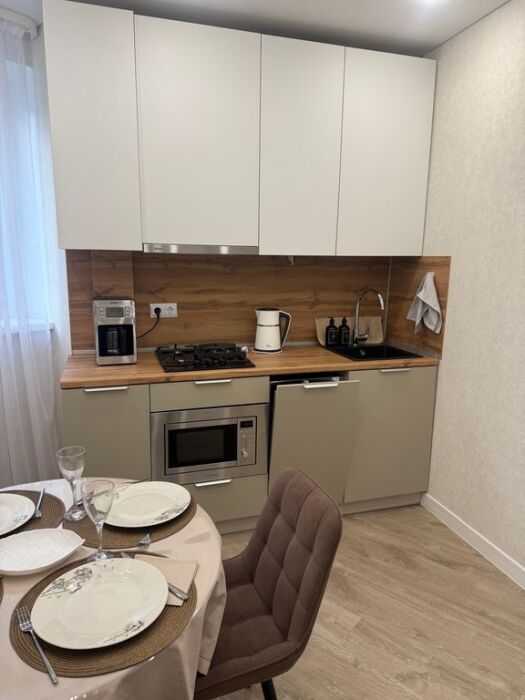 Полностью оборудованная кухня: варочная панель, микроволновая печь, посудомоечная машина(капсулы предоставляю), кофе машина(и вкусный кофе), встроенный фильтр для питьевой воды(чистая питьевая вода в любом количестве), вся необходимая посуда.