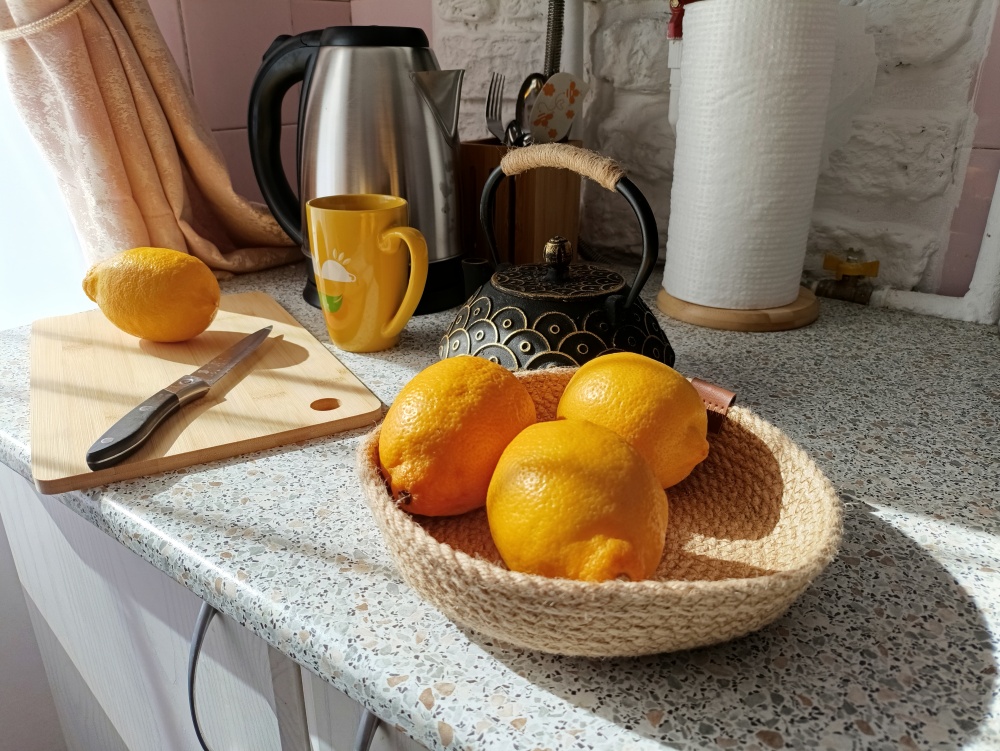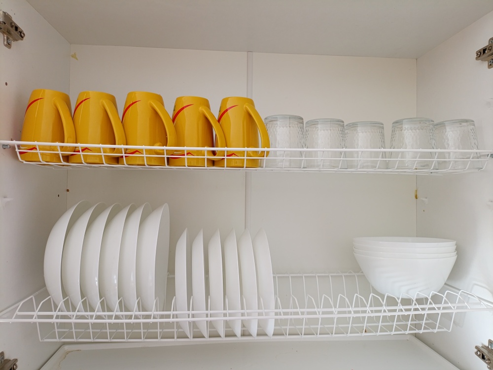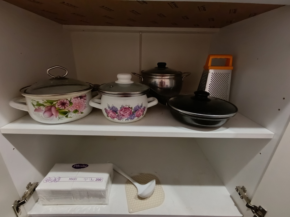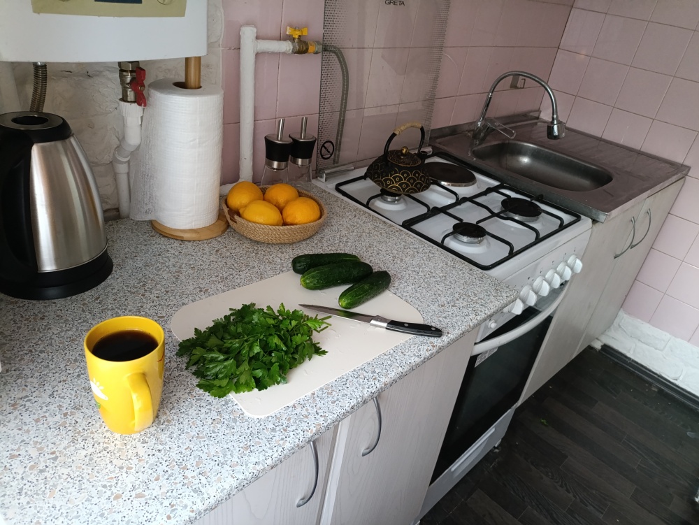 Кухня: холодильник, СВЧ, чайник, газовая плита с дополнительной электроконфоркой, духовка, фильтр для воды, набор посуды и столовые приборы, набор кастрюль, сковорода, чай, кофе, соль, сахар.