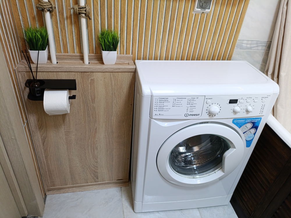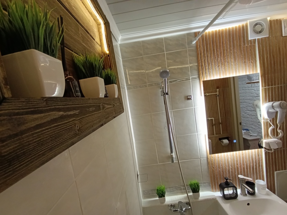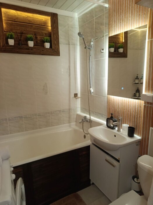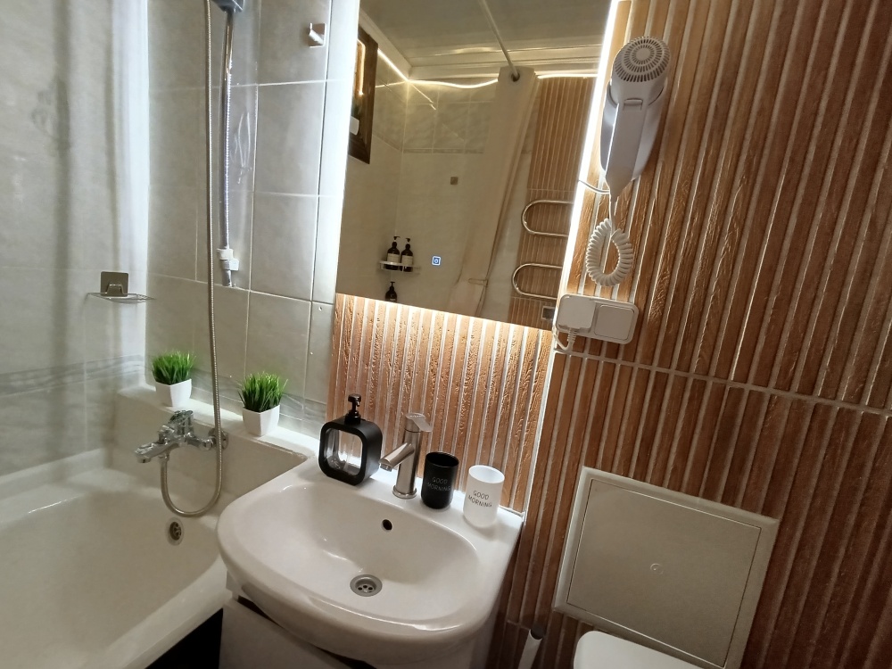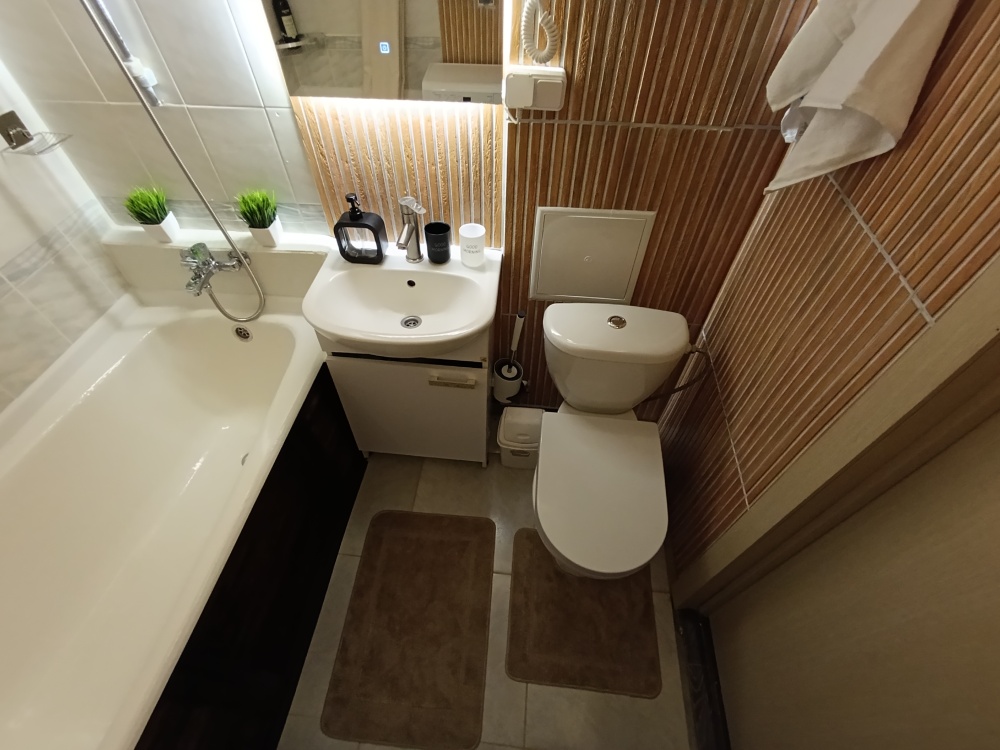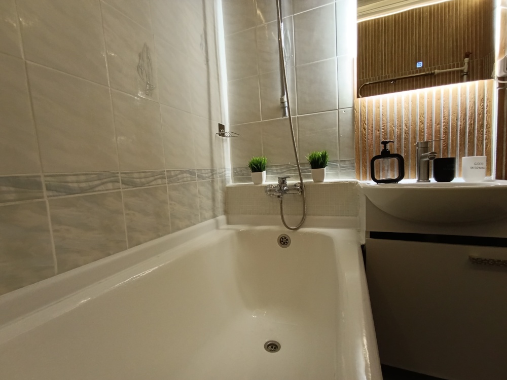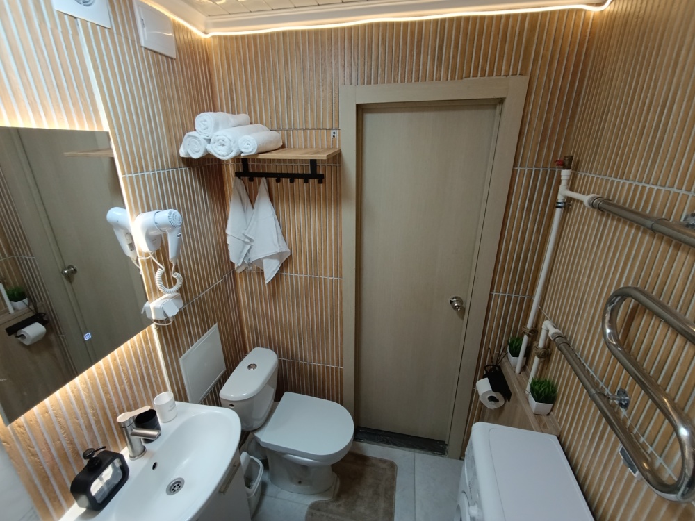 Ванная: стиральная машина на 5 кг, три режима освещения, новая сантехника, набор полотенец, фен, сиденье с микролифтом, шампунь, мыло, гель для душа, горячая вода круглый год на газу, ночная подсветка с датчиком движения.