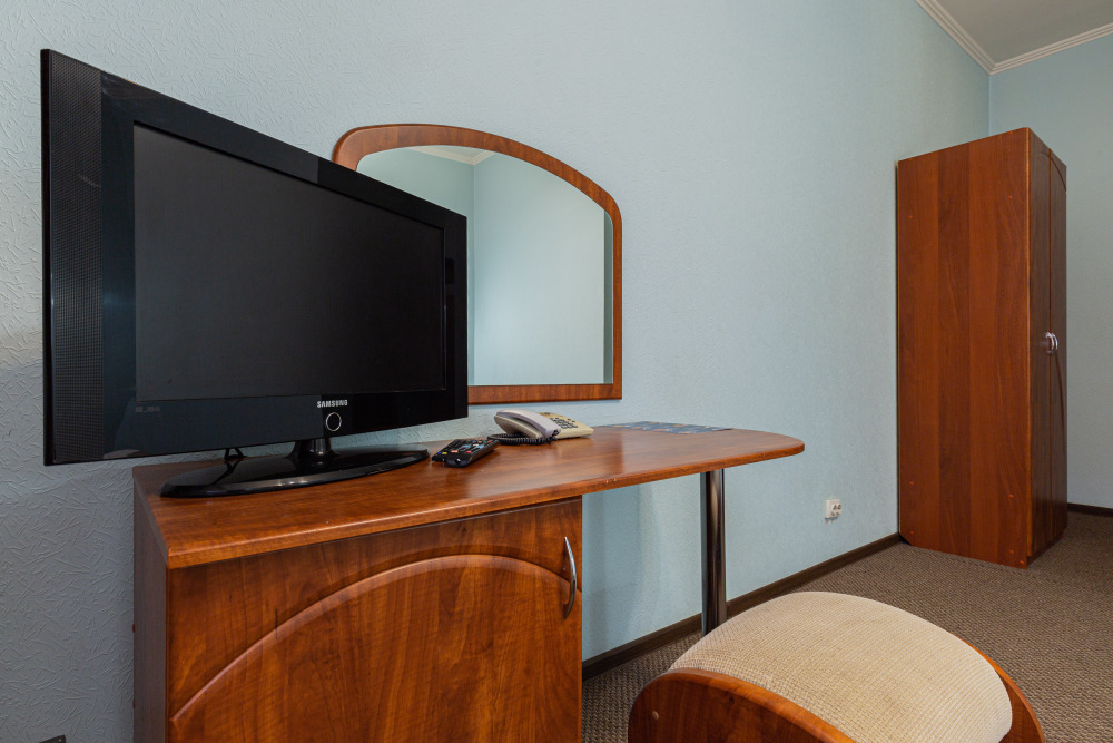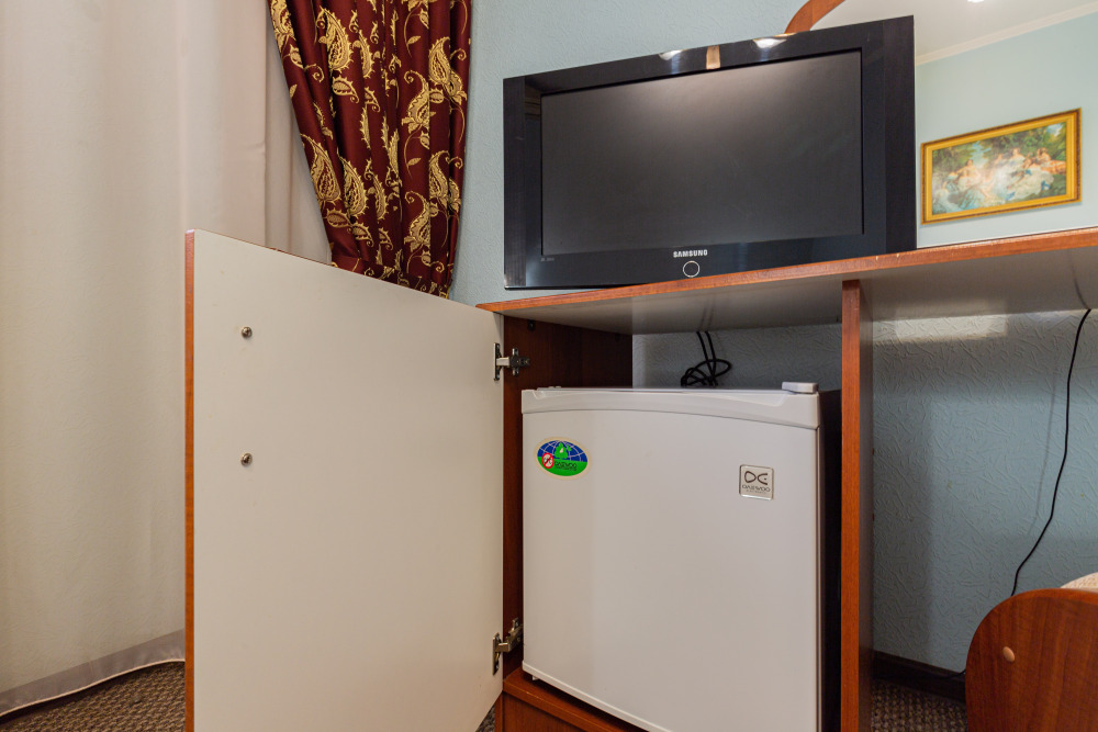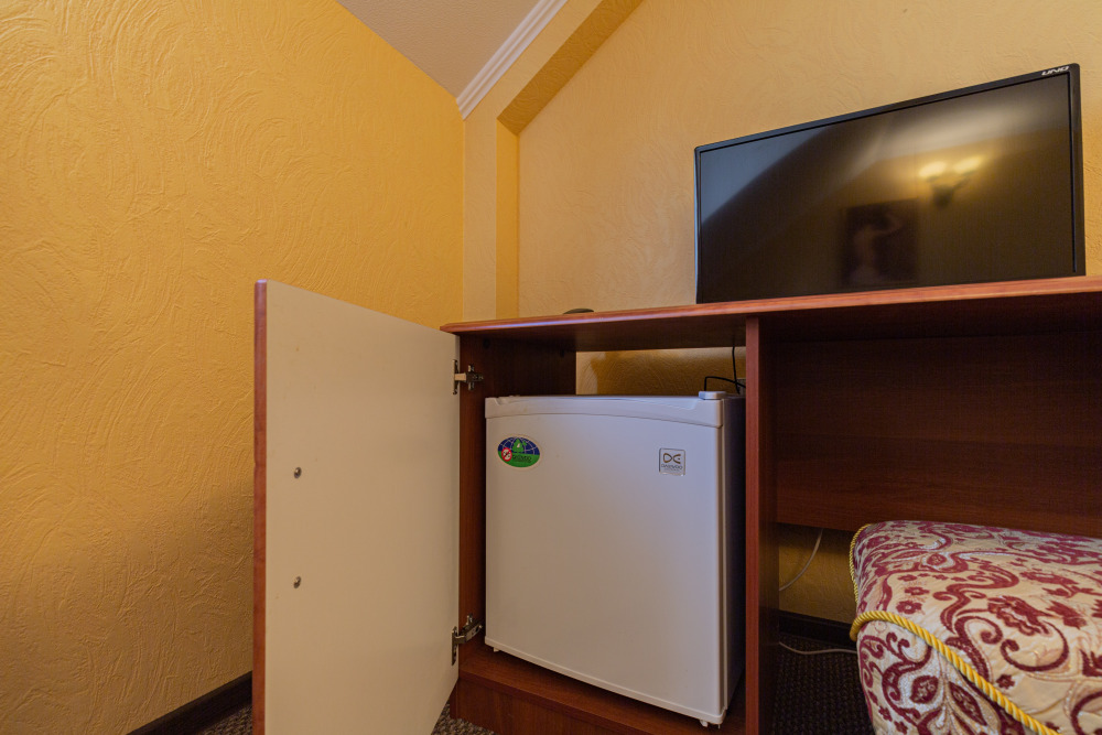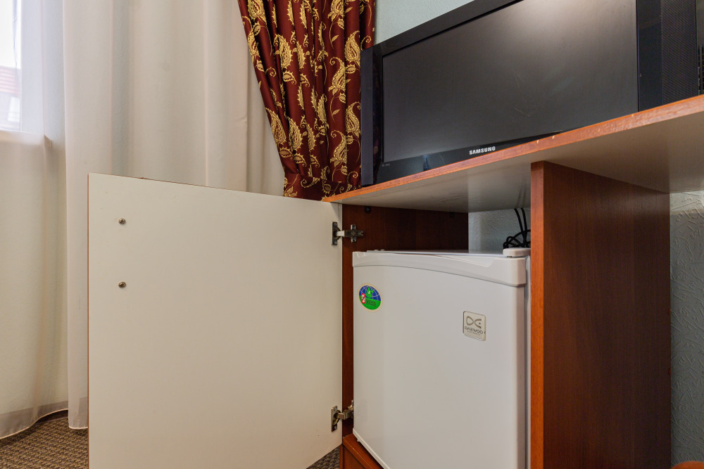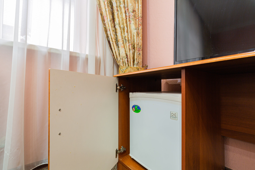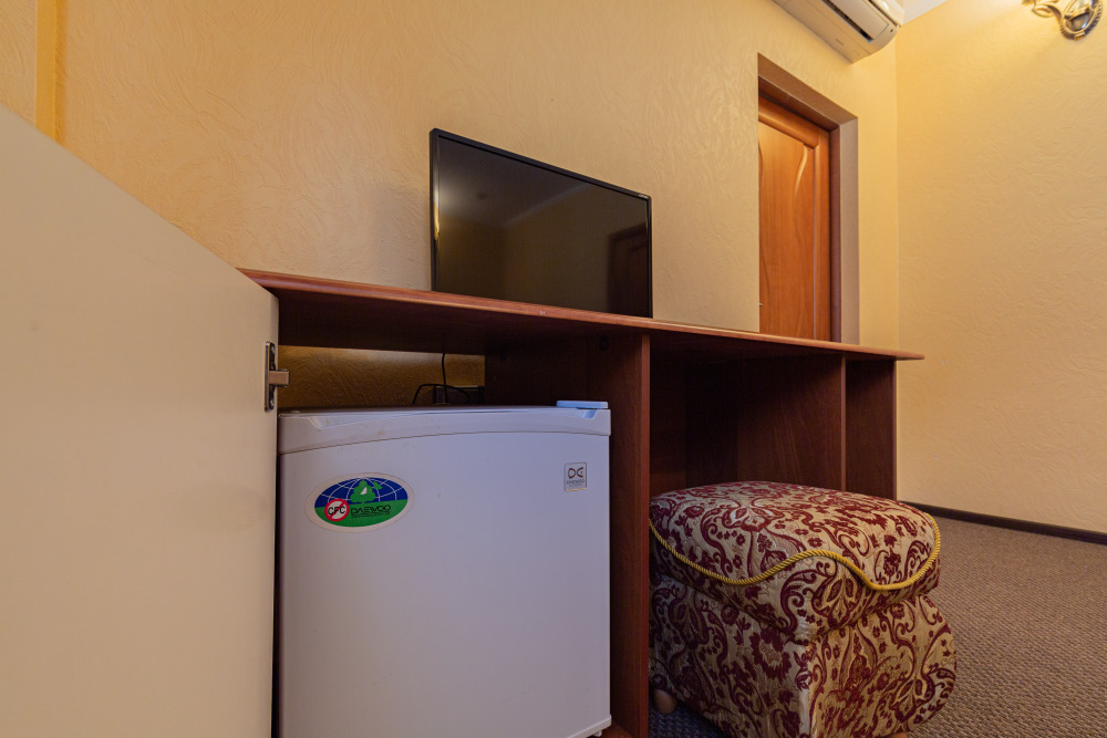 В номере — двуспальная кровать трансформер, шкаф для одежды, кондиционер. Интерьер оформлен в светлых тонах, а компактная планировка включает всё необходимое для отдыха и работы: телевизор, бесплатный Wi-Fi, мини-холодильник и телефон для связи с ресепшн.