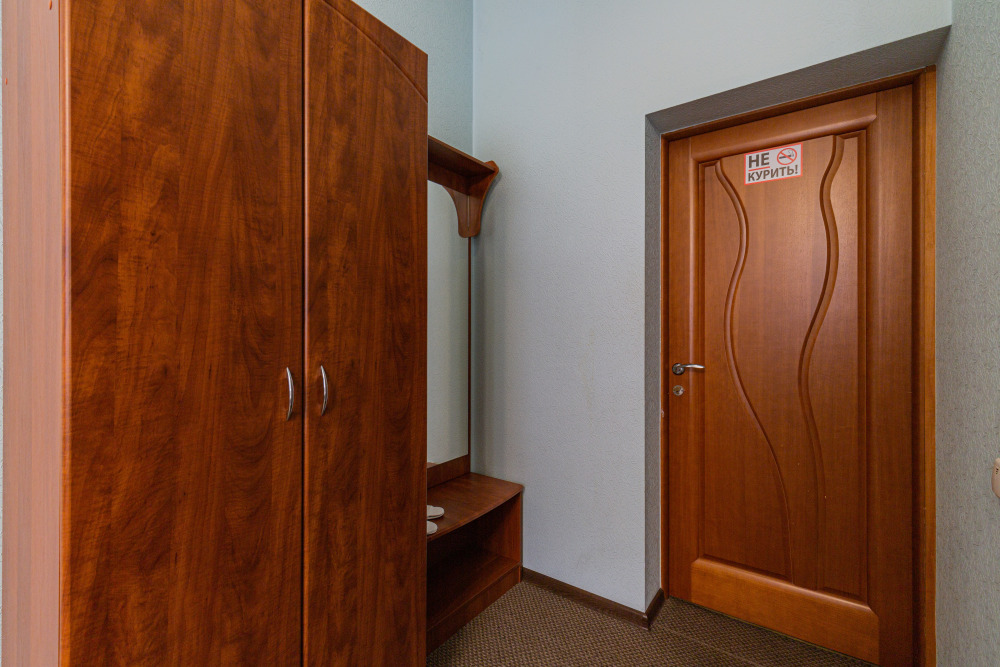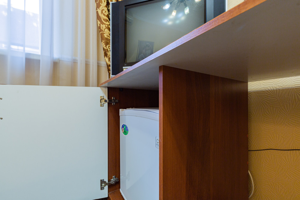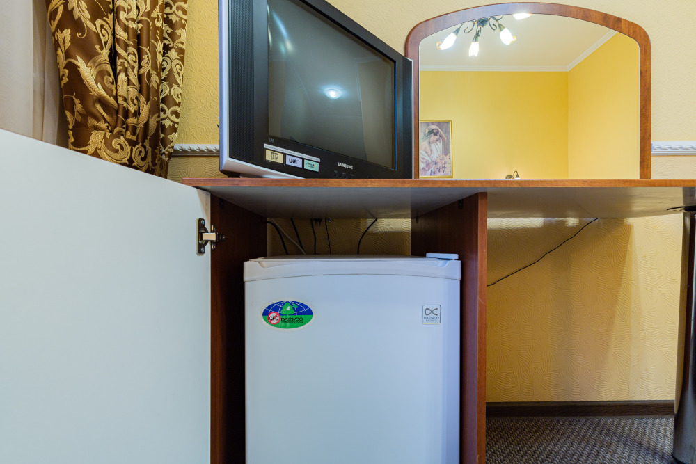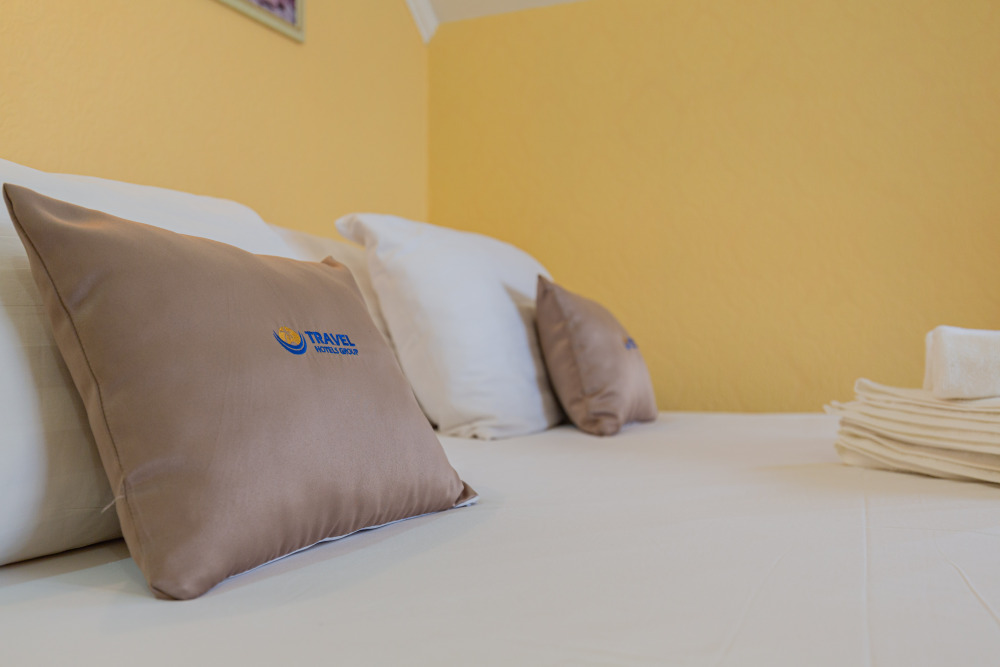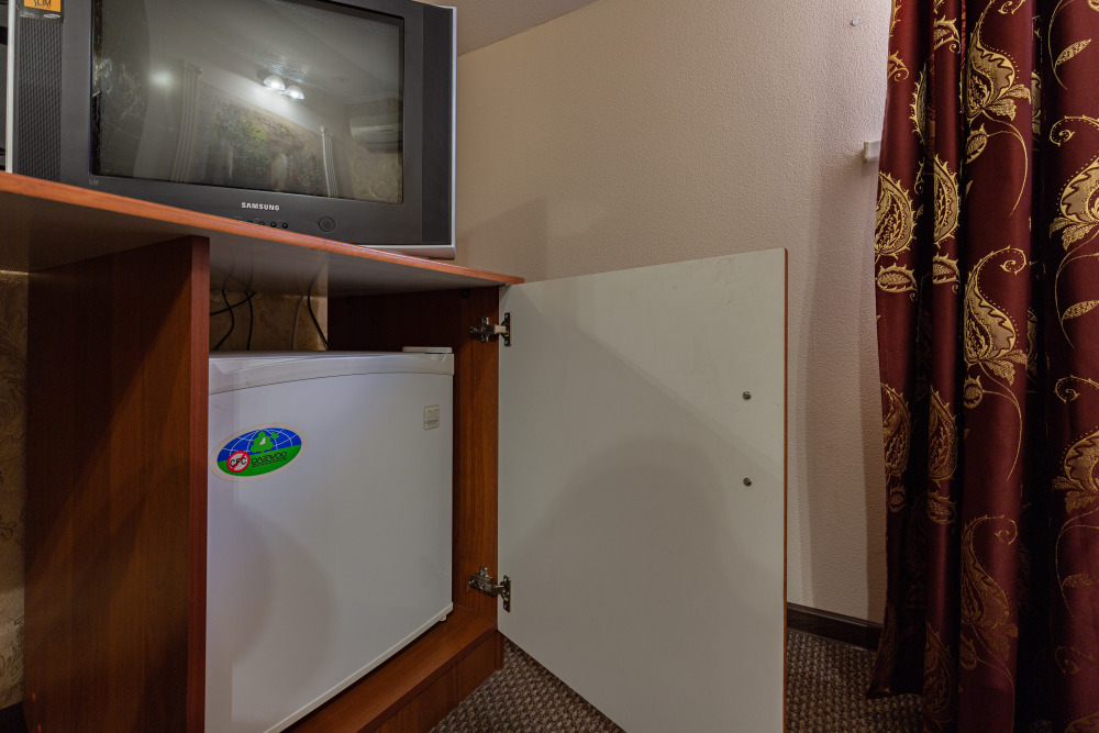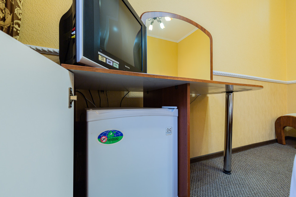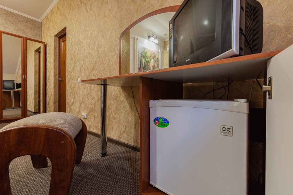 В номере — двуспальная кровать трансформер, шкаф для одежды, кондиционер. Интерьер оформлен в светлых тонах, а компактная планировка включает всё необходимое для отдыха и работы: телевизор, бесплатный Wi-Fi, мини-холодильник и телефон для связи с ресепшн.