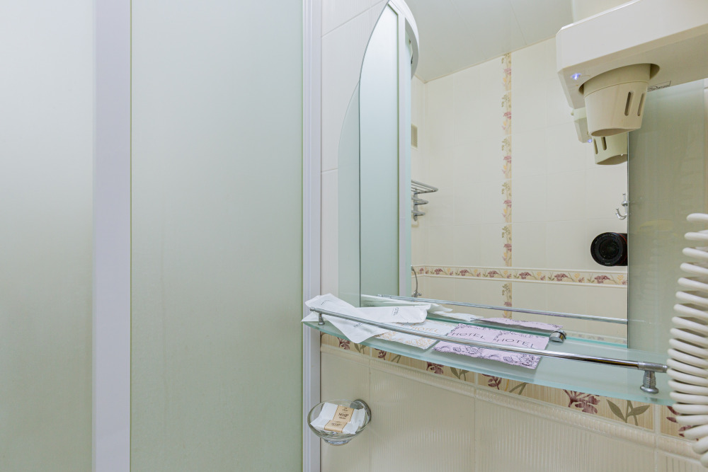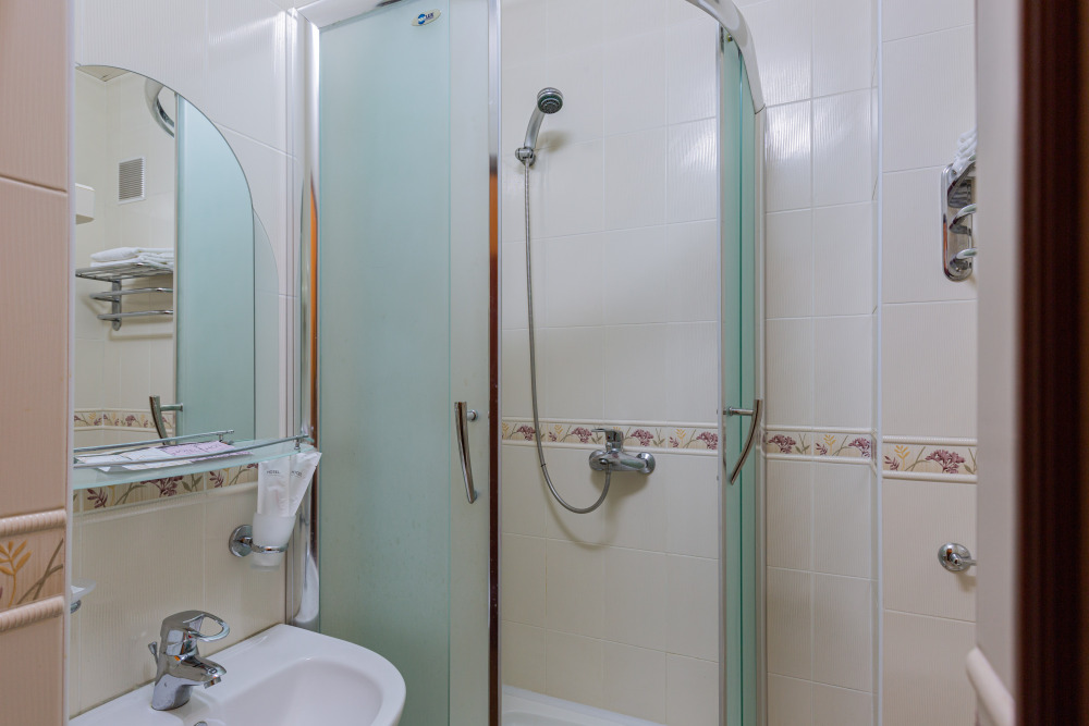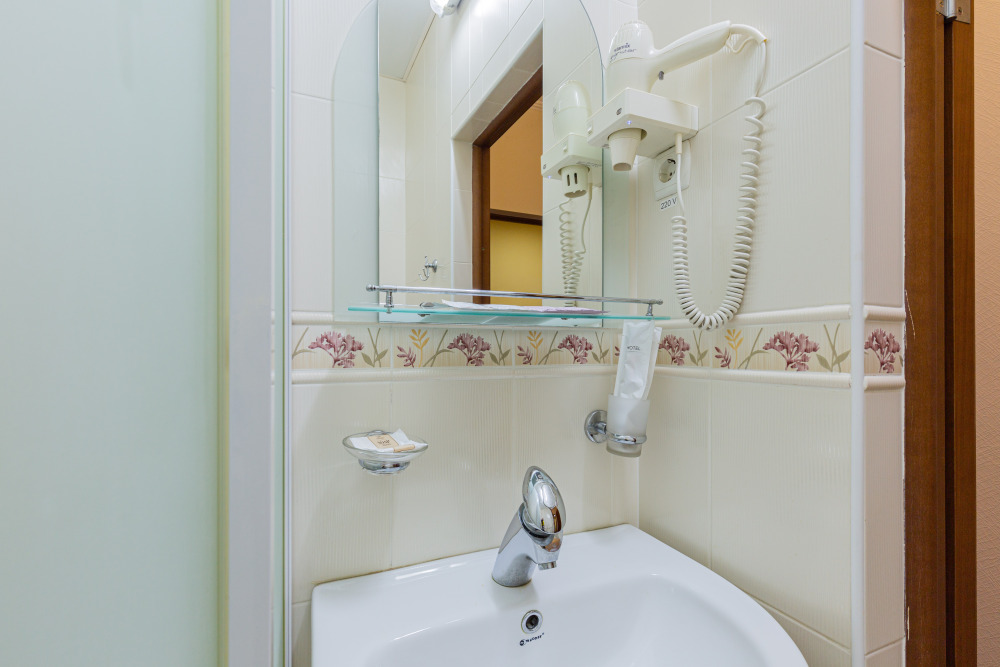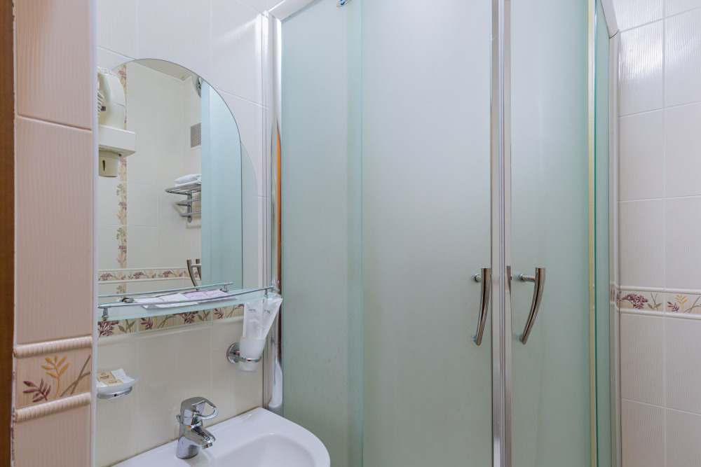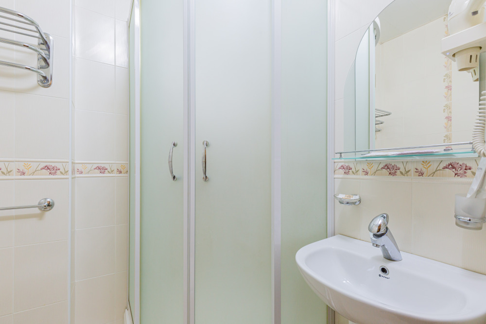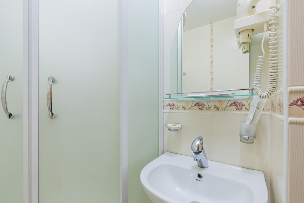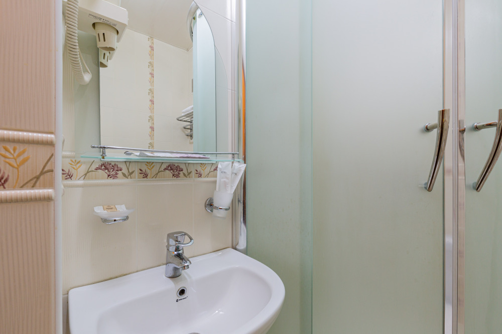 Ванная комната оборудована душевой кабиной, феном, набором полотенец и базовыми гигиеническими принадлежностями — всё, что нужно для комфортного начала и завершения дня.