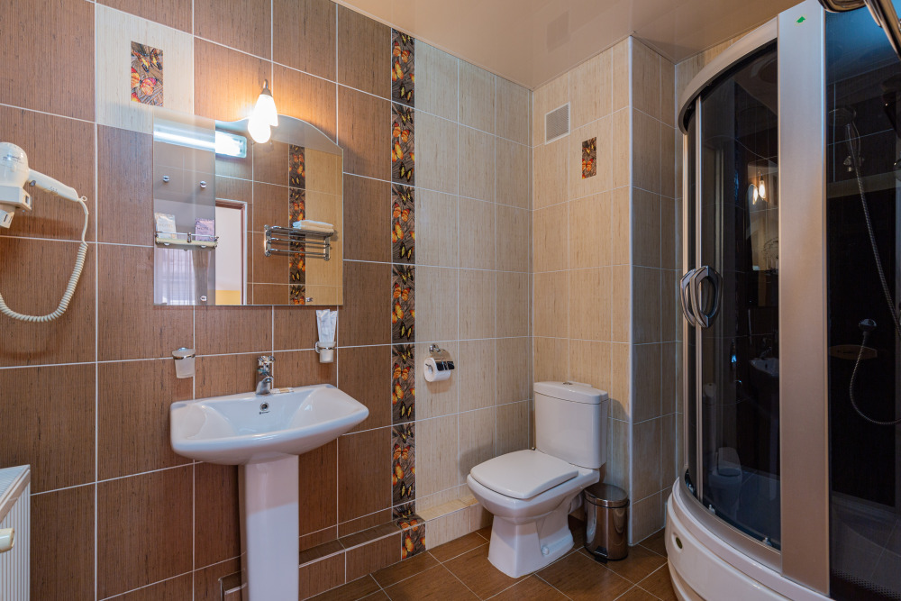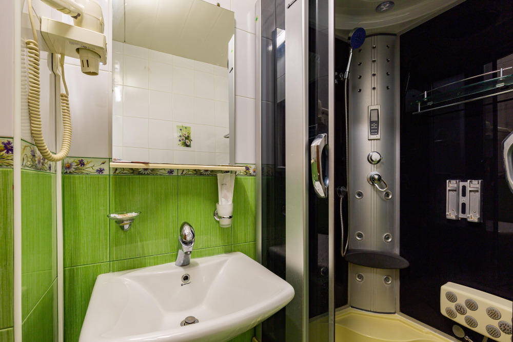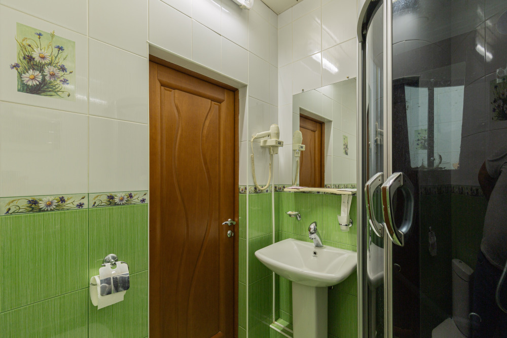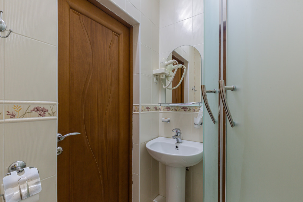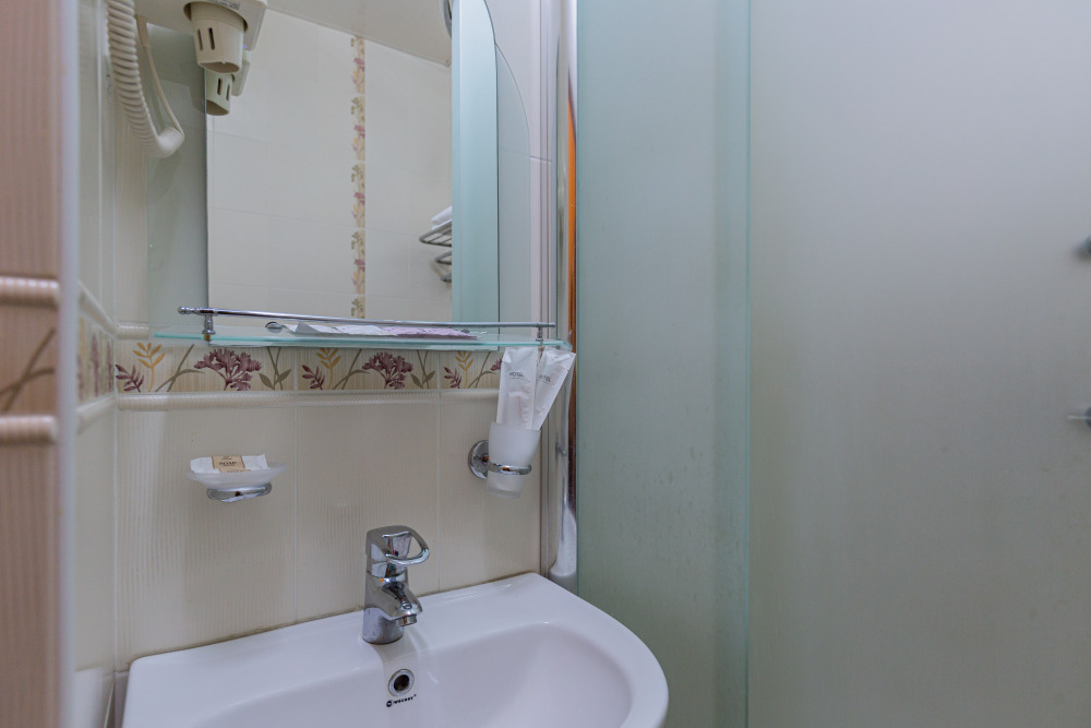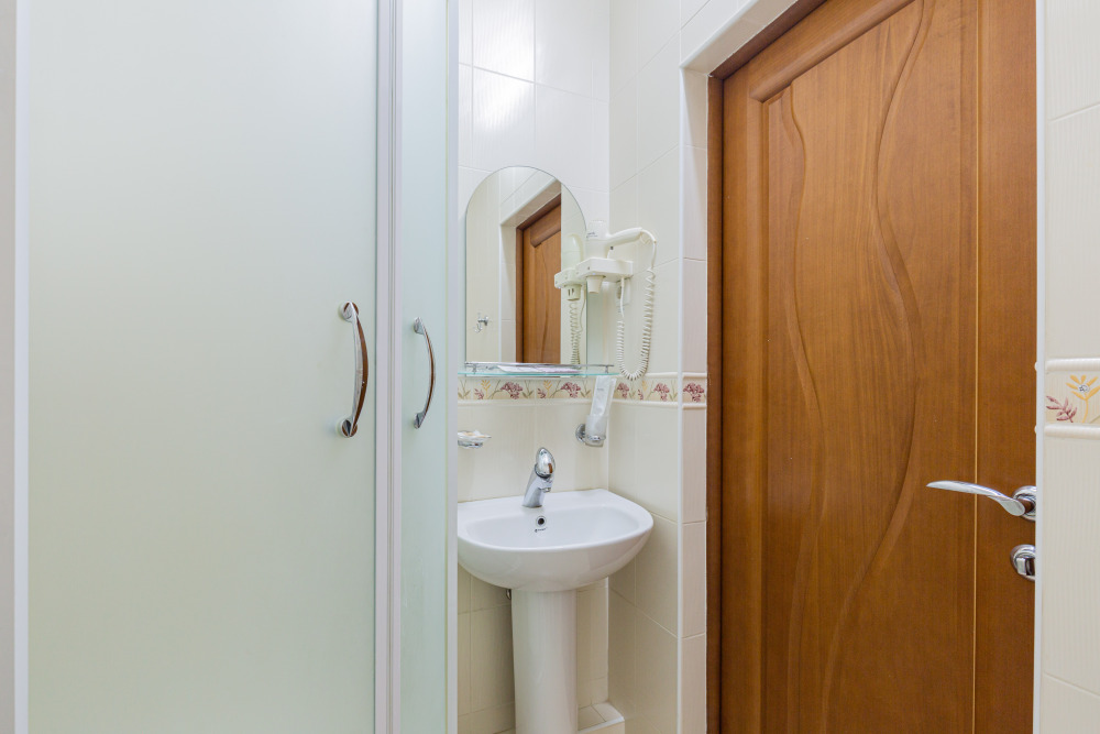 Ванная комната оборудована душевой кабиной, феном, набором полотенец и базовыми гигиеническими принадлежностями — всё, что нужно для комфортного начала и завершения дня.