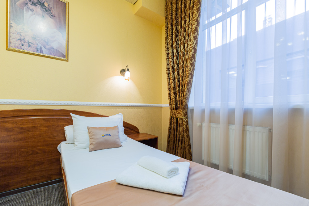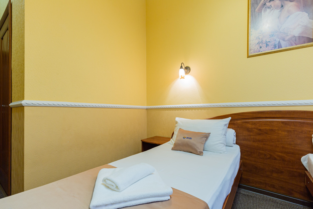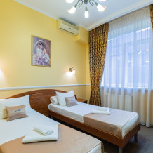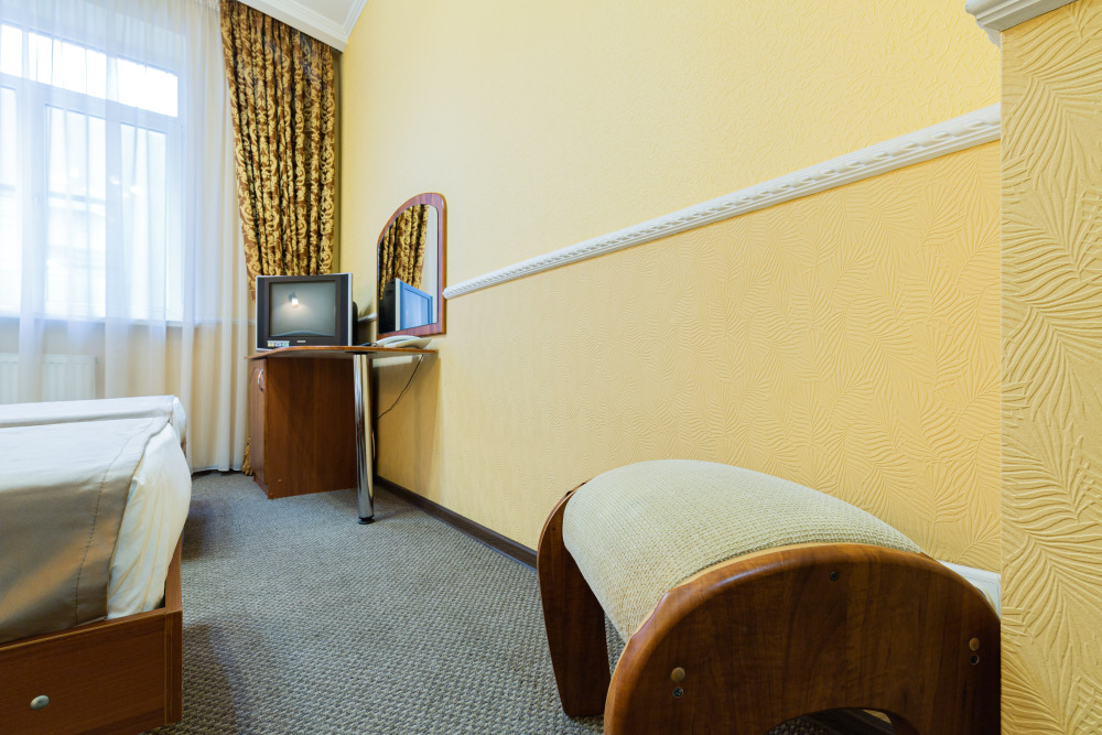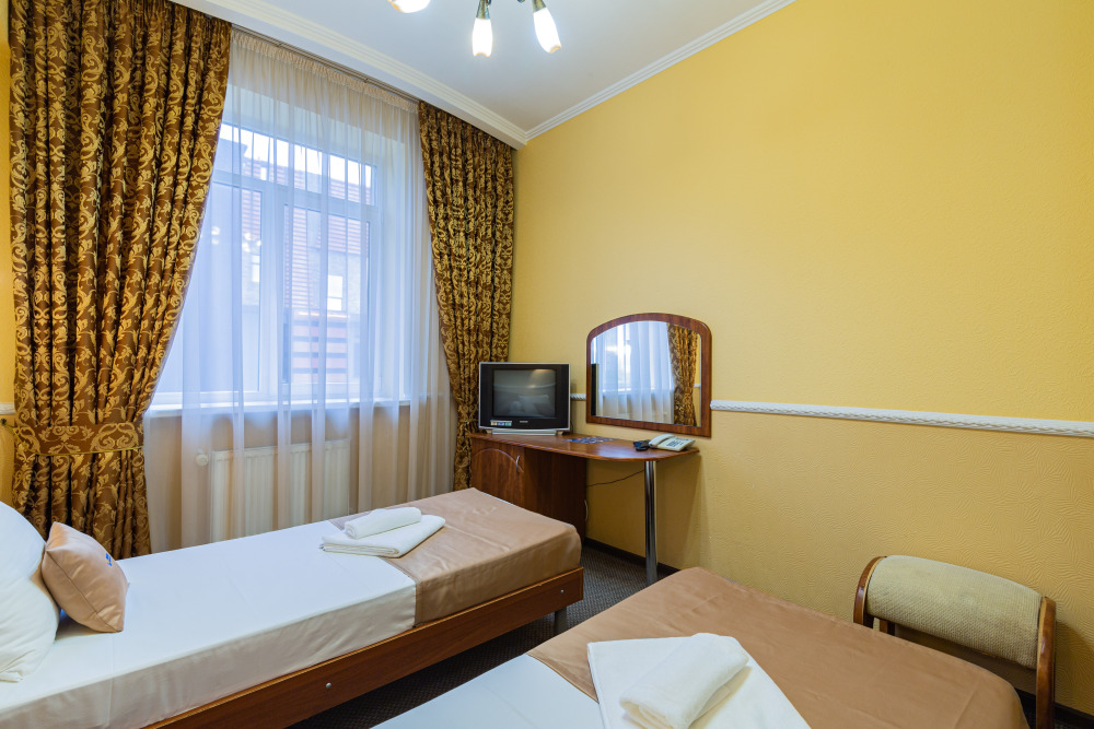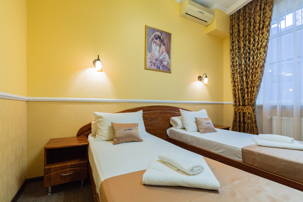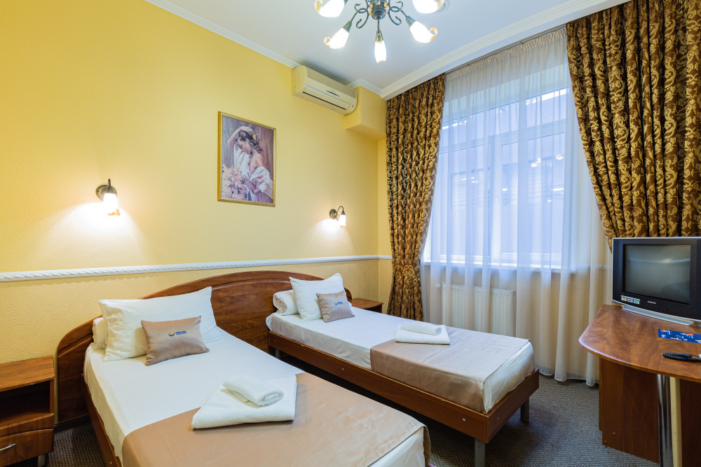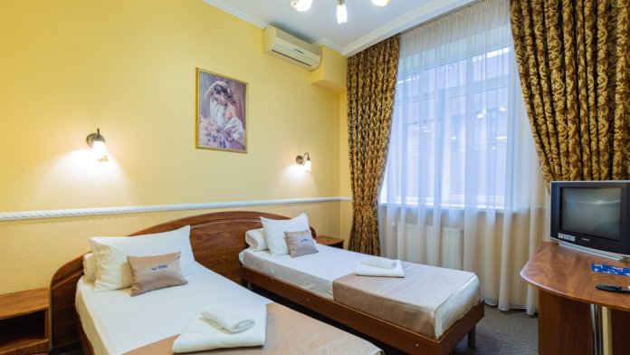 В номере — две односпальные кровати, что обеспечивает гибкость размещения. Интерьер оформлен в светлых тонах, а компактная планировка включает всё необходимое для отдыха и работы: кондиционер, телевизор, бесплатный Wi-Fi, мини-холодильник и телефон для связи с ресепшн.