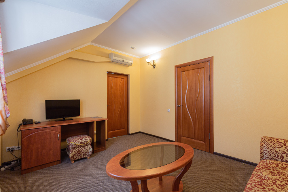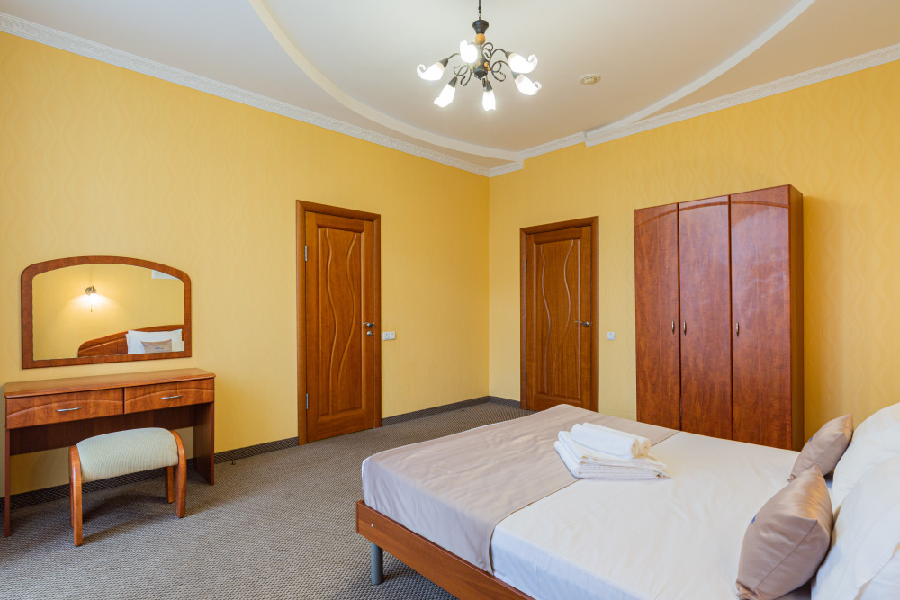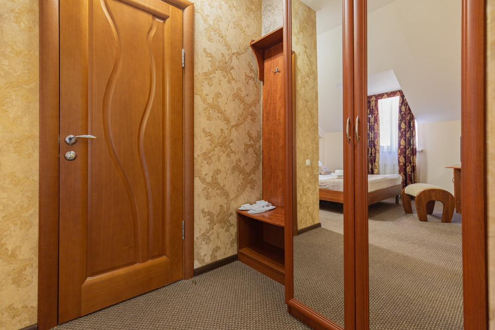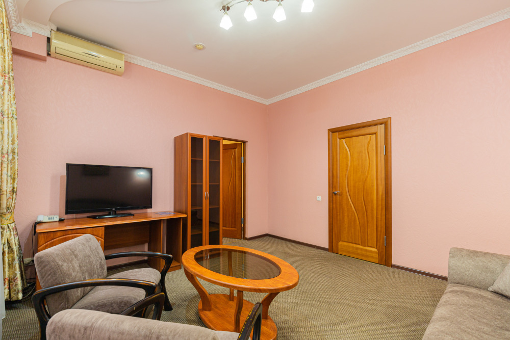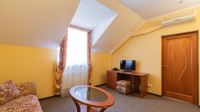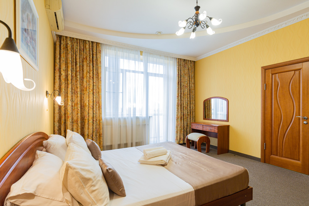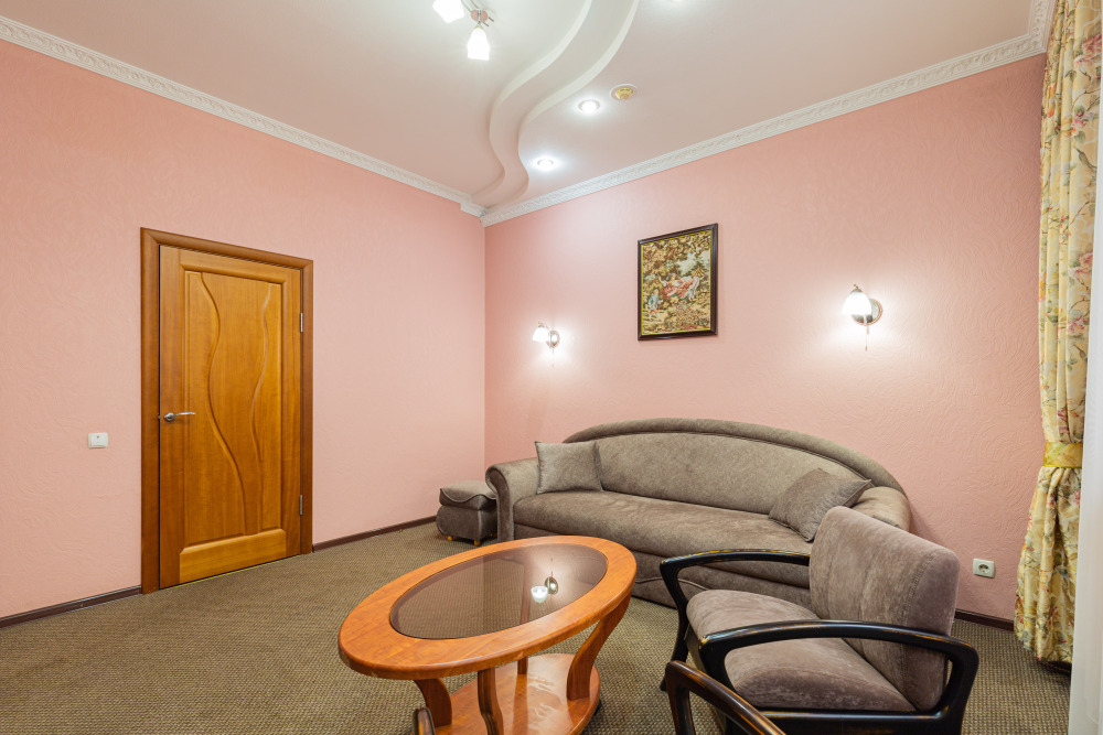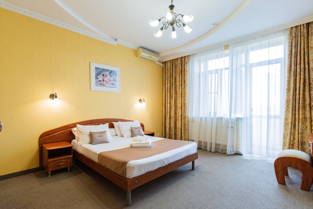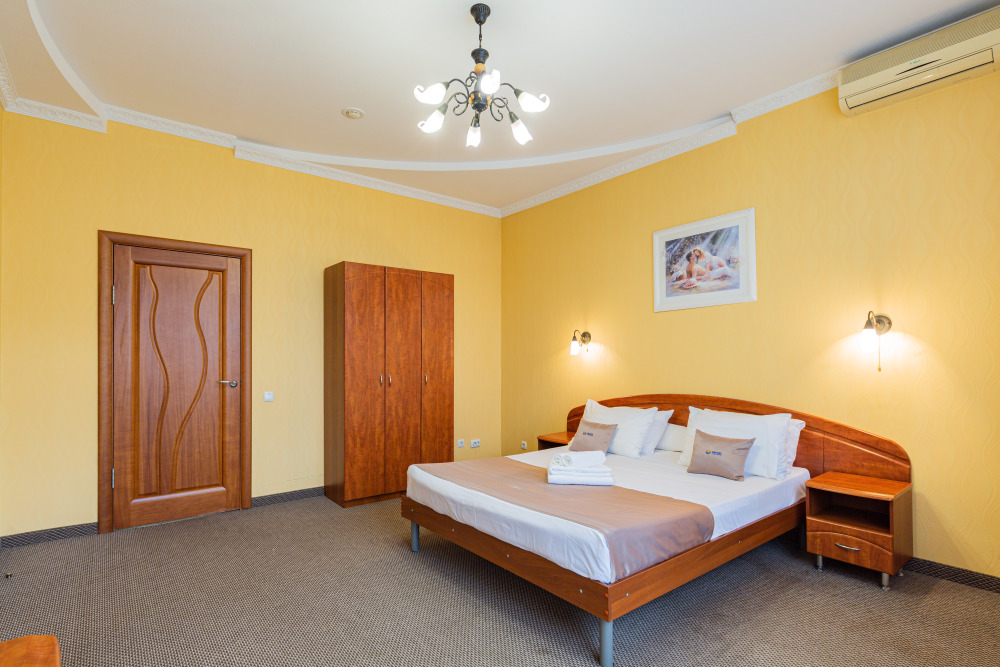 Просторный номер категории Люкс — это отличный выбор для тех, кто ценит комфорт и спокойствие. Он идеально подойдёт для семей, молодых путешественников и всех, кто ищет уютное пространство для отдыха в командировке или на выходных. Номер также прекрасно подходит для размещения с детьми.