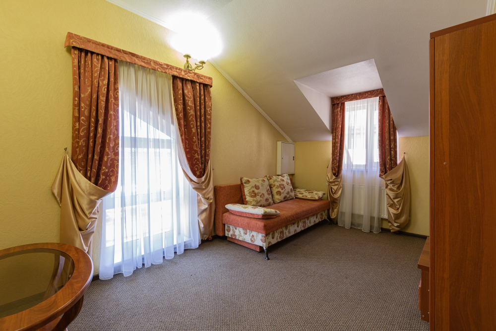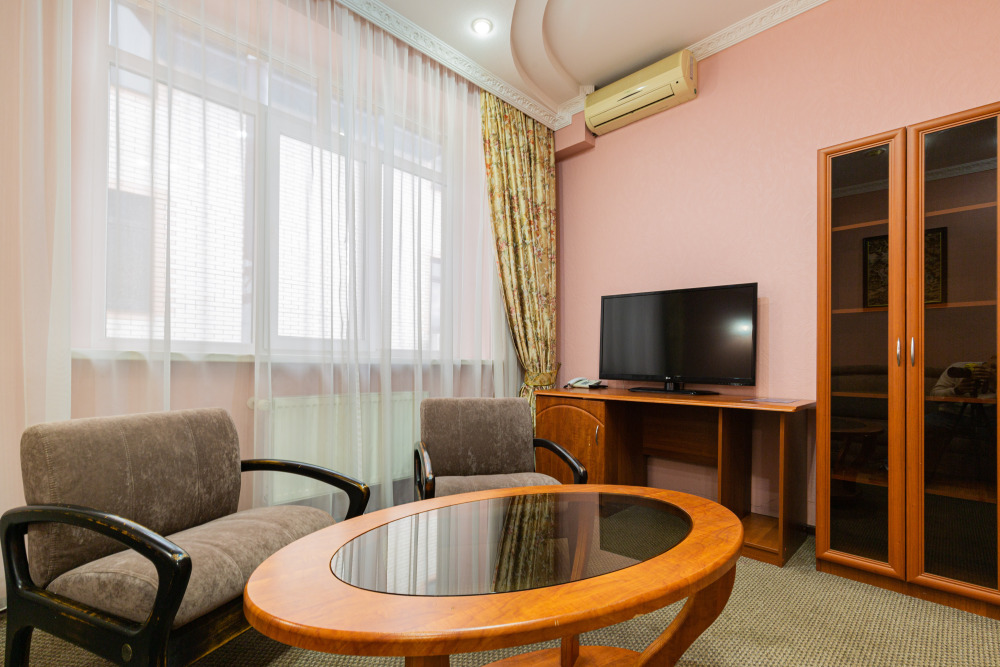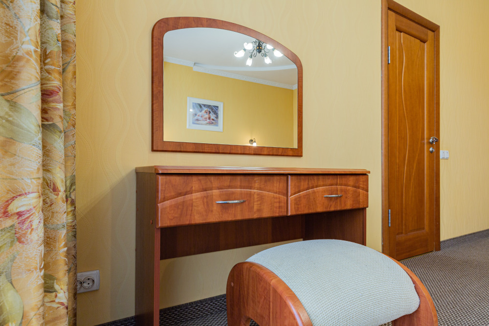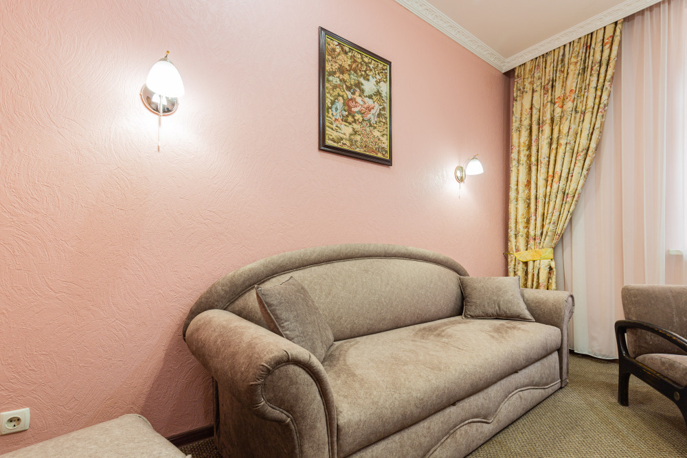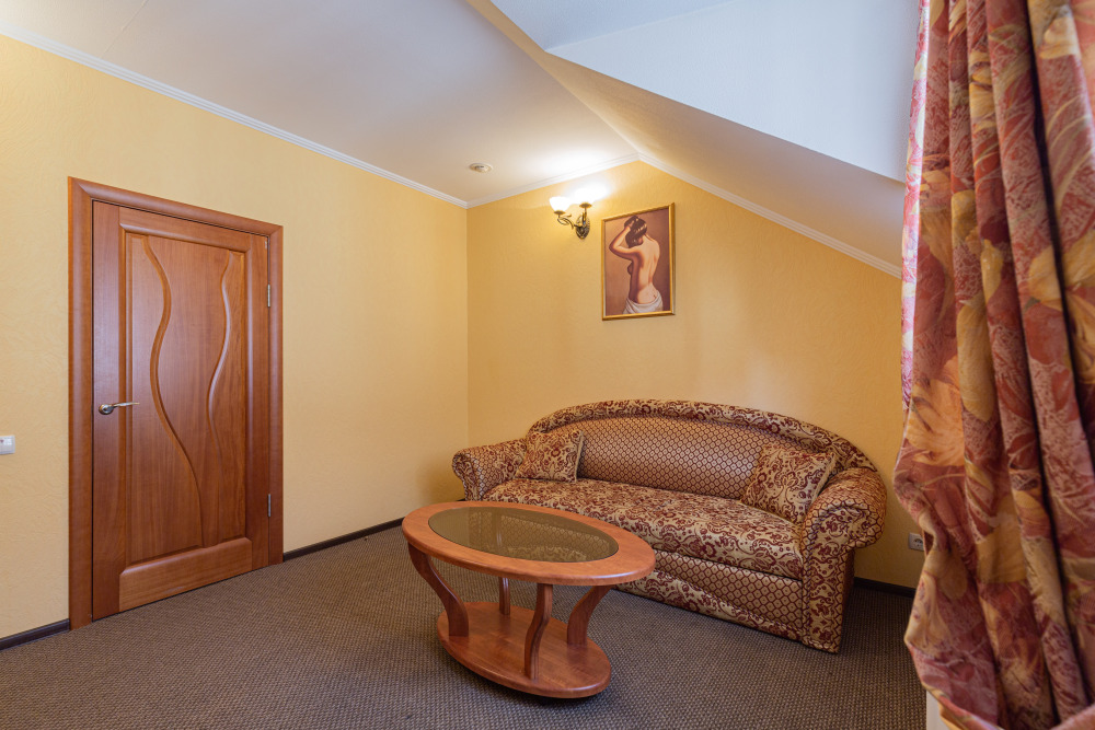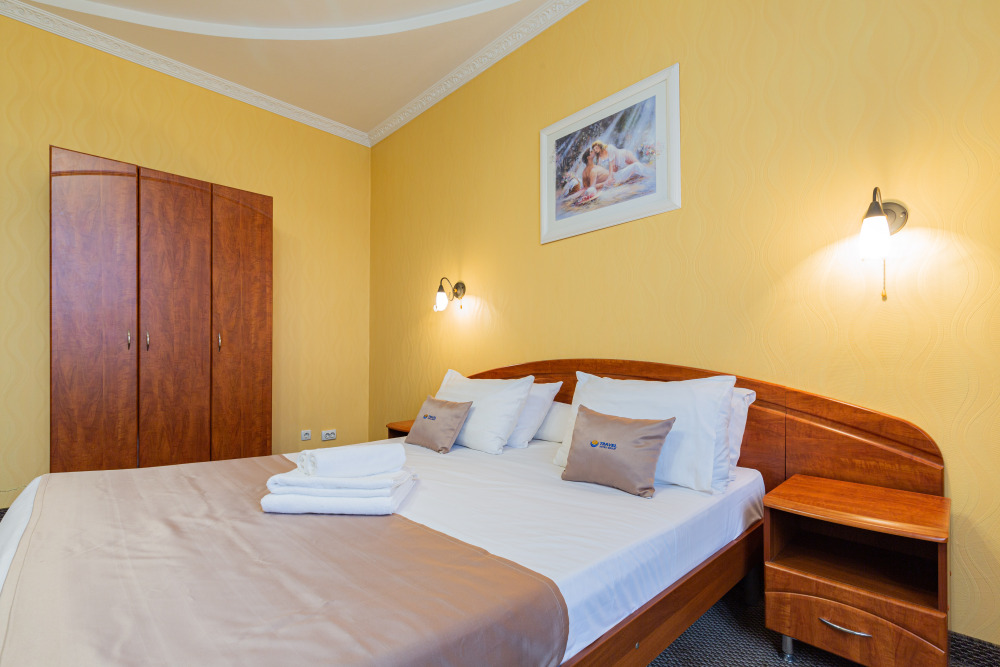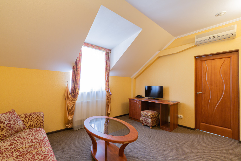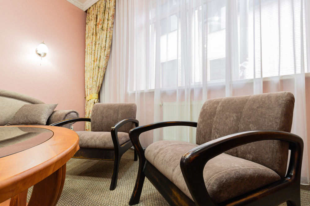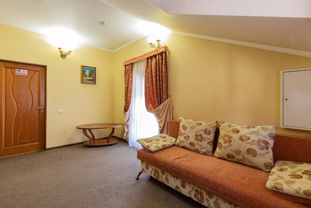 Просторный номер категории Люкс — это отличный выбор для тех, кто ценит комфорт и спокойствие. Он идеально подойдёт для семей, молодых путешественников и всех, кто ищет уютное пространство для отдыха в командировке или на выходных. Номер также прекрасно подходит для размещения с детьми.