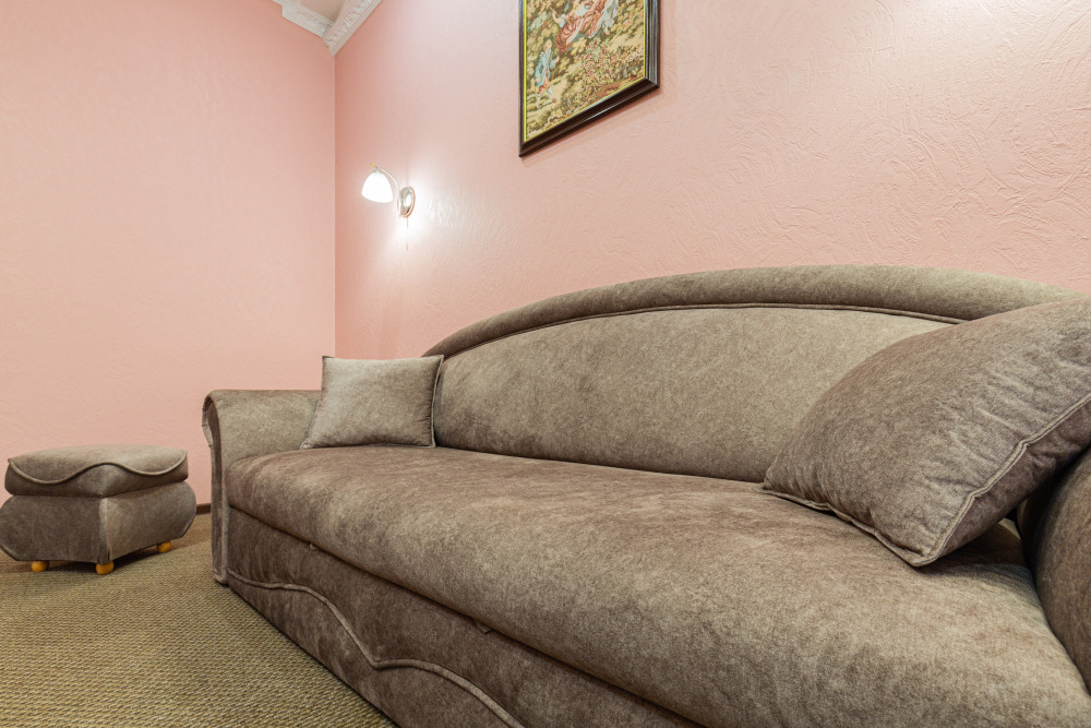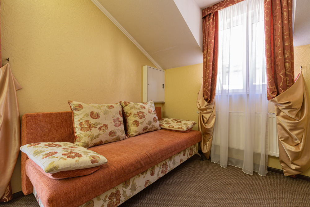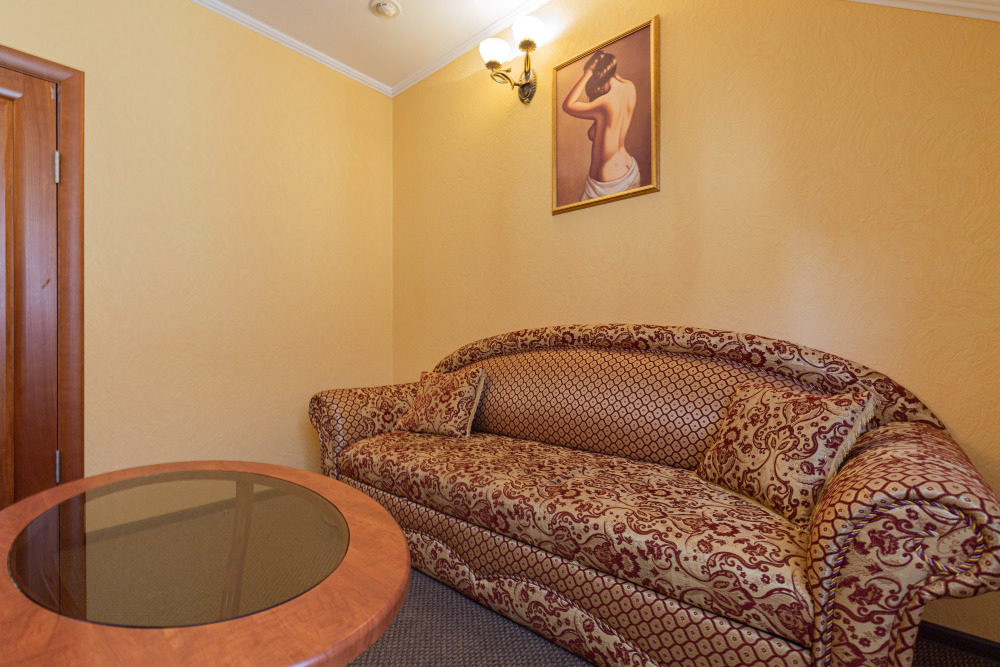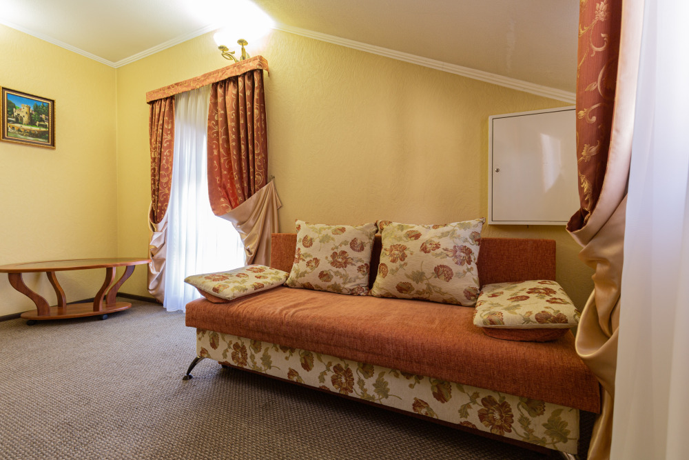 В номере предусмотрена одна двуспальная кровать и раскладной двуспальный диван — удобная конфигурация как для семейного отдыха, так и для размещения коллег.