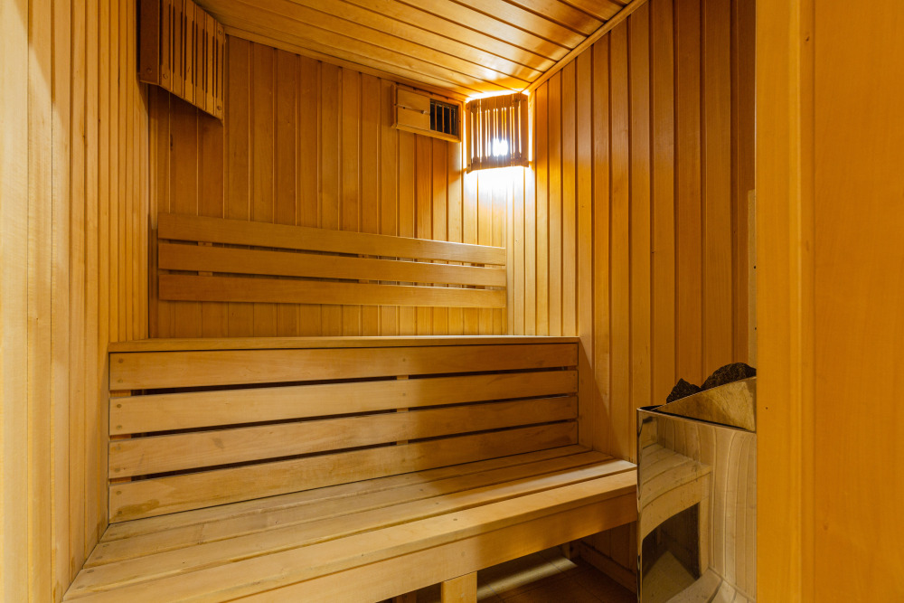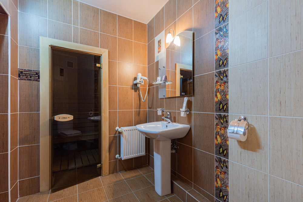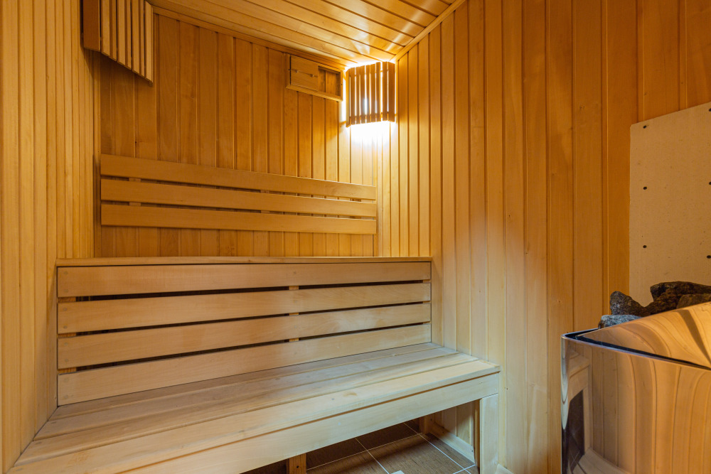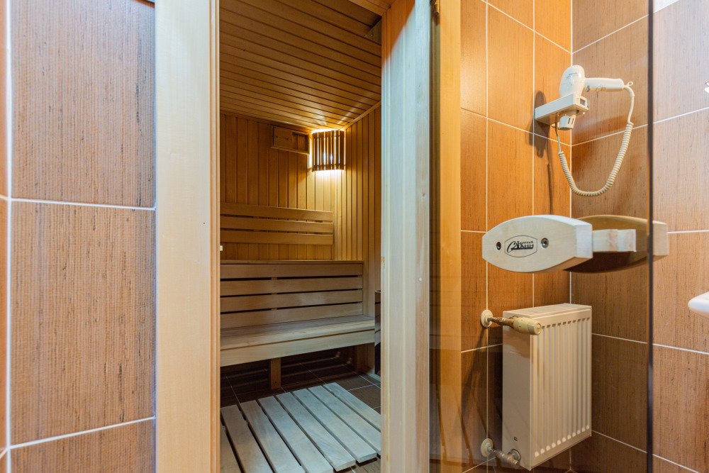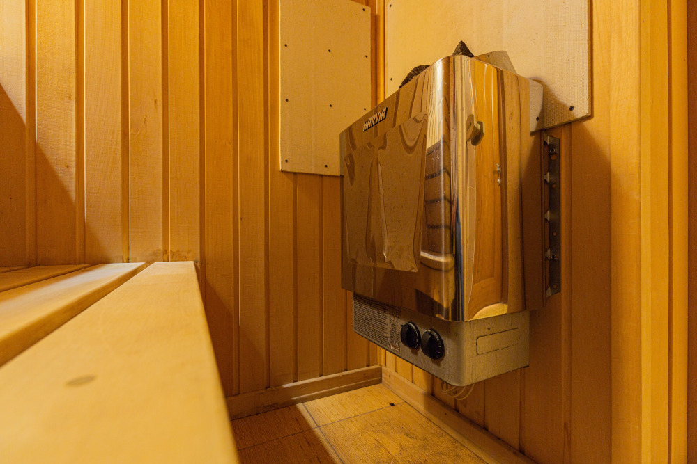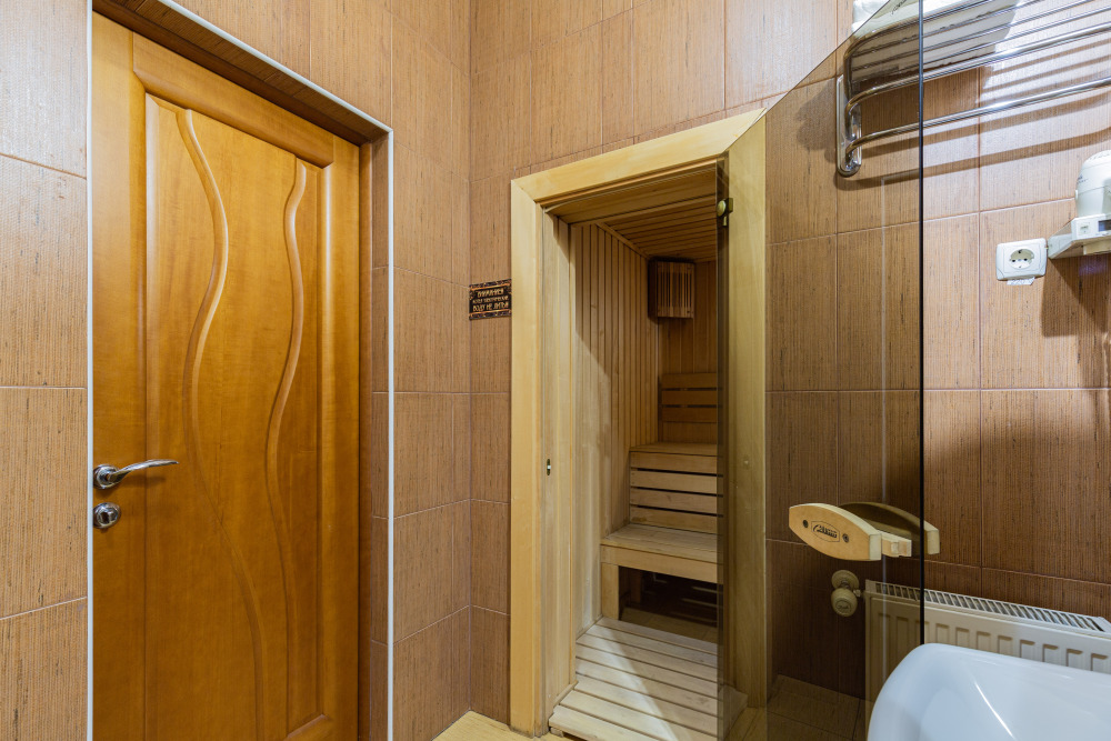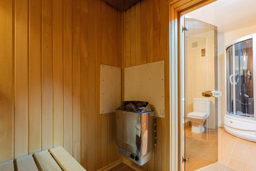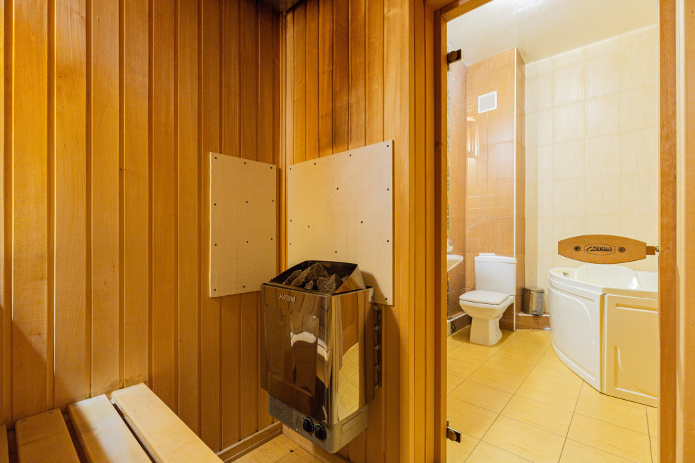 В просторной ванной комнате: ванная и собственная сауна — идеальное сочетание для расслабления после активного дня.