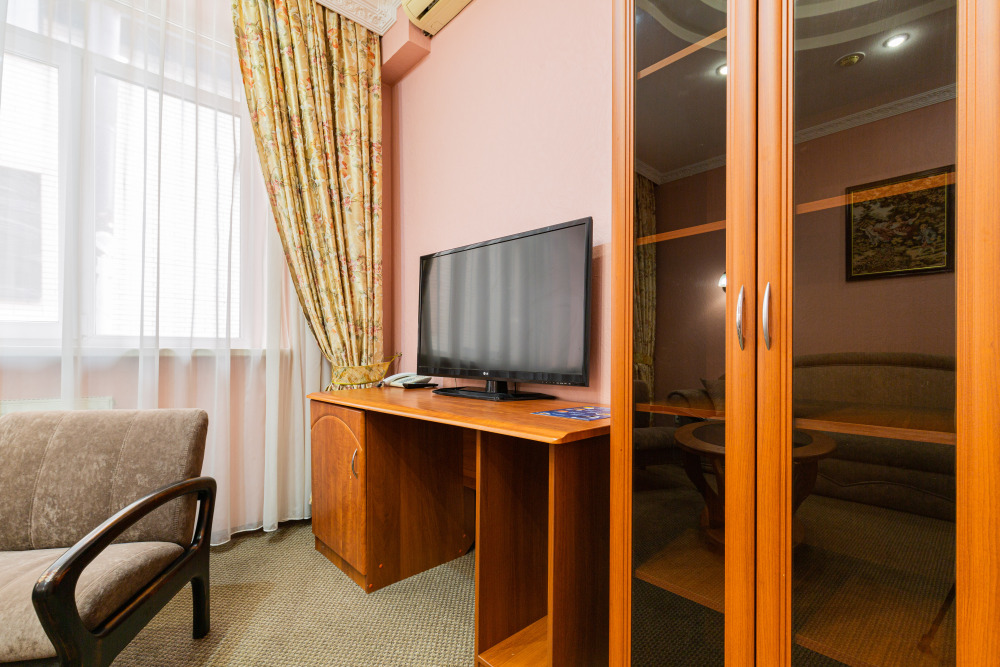 В номере: одна двуспальная кровать и диван, прикроватные тумбы, шкаф/гардероб, телевизор, телефон, стол, холодильник и кондиционер, рабочий стол и уютный гостиный уголок для отдыха или общения.
