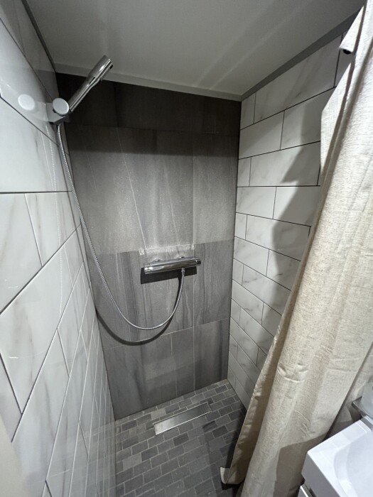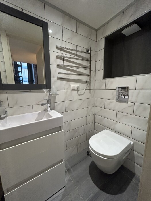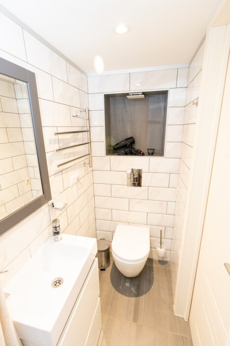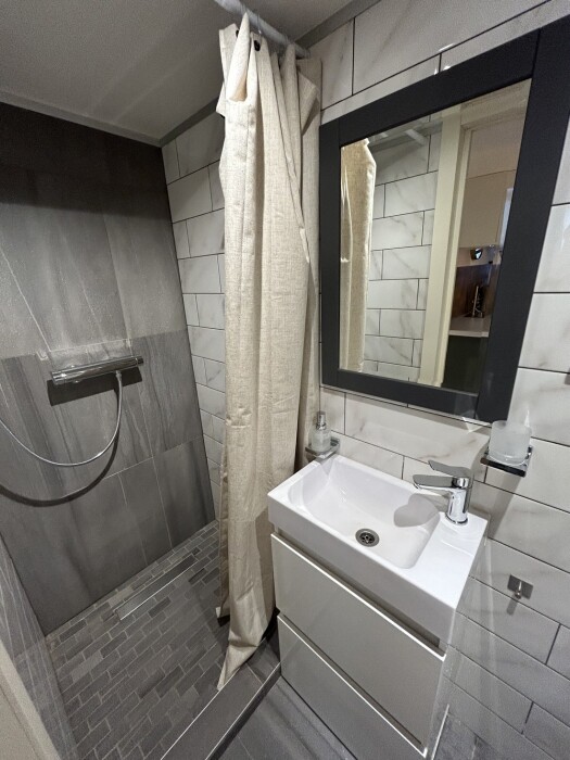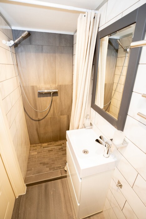 Индивидуальная ванная комната: душ, раковина, туалет.