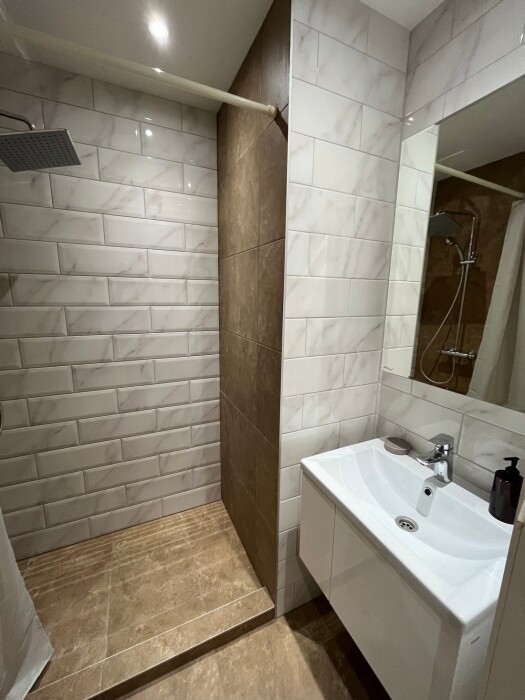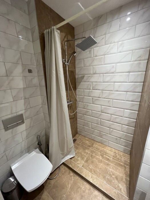 Индивидуальная ванная комната: душ, раковина, туалет.