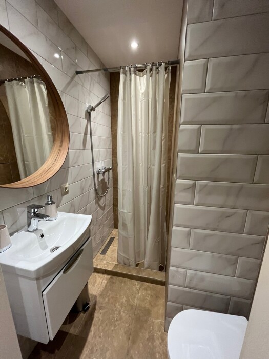 Индивидуальная ванная комната: душ, раковина, туалет.