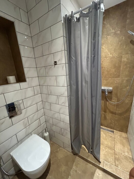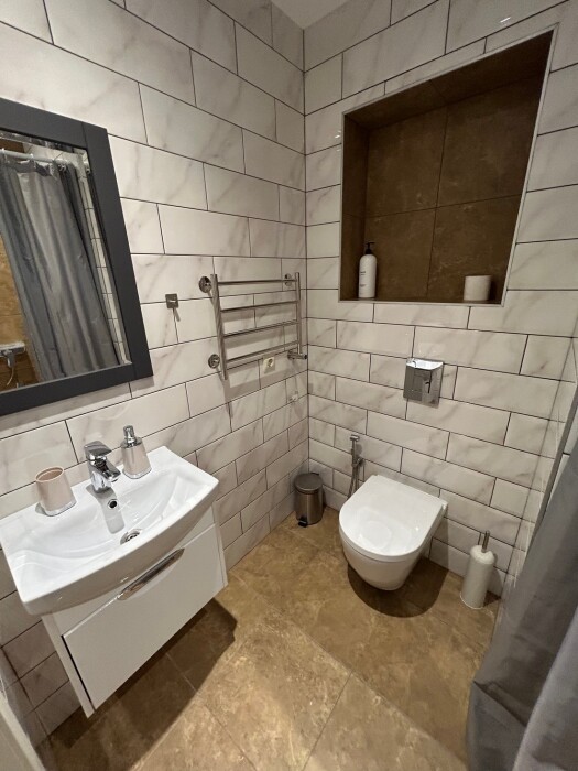Индивидуальная ванная комната: душ, раковина, туалет.
