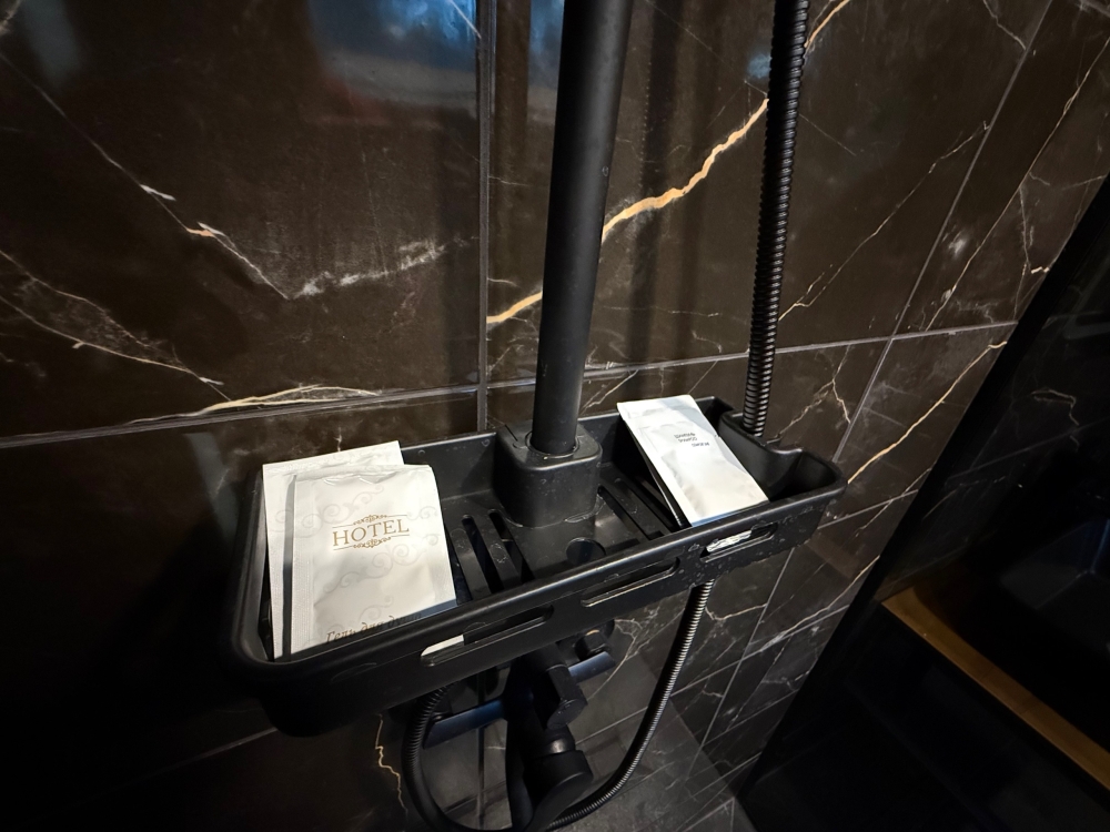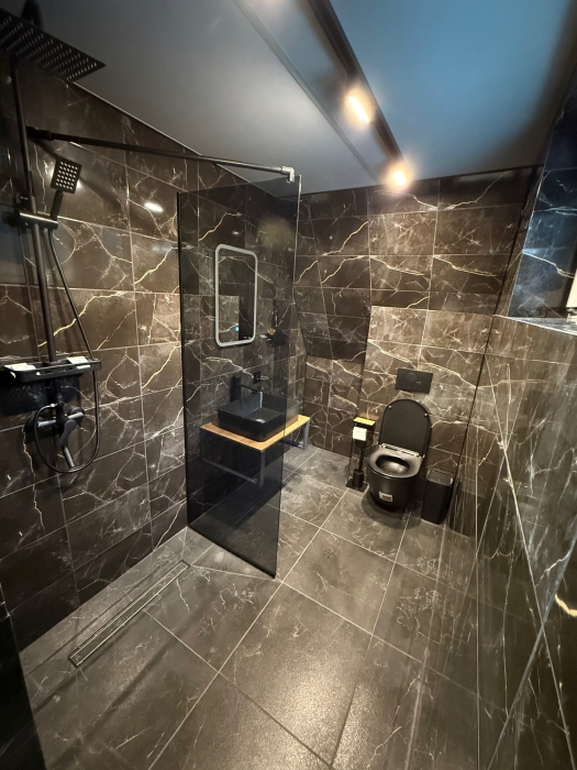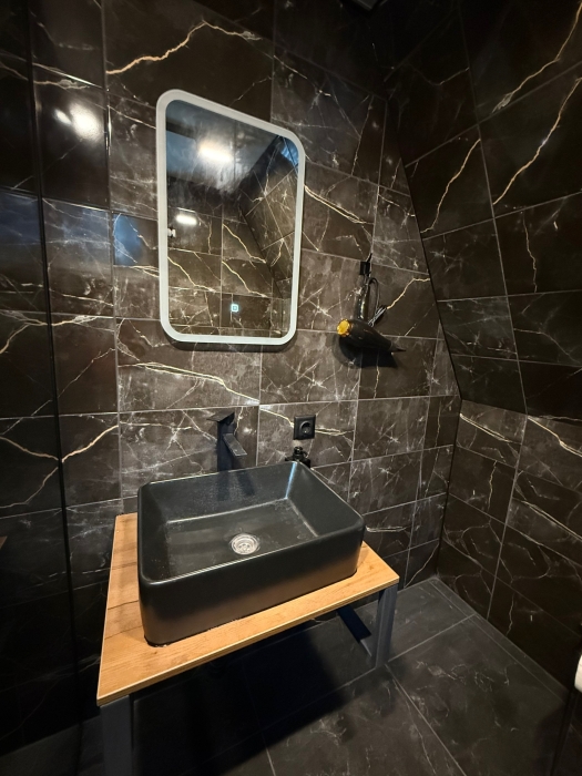 Санузел в доме: душ, туалет, фен, полотенца, тапочки, шампунь и гель для душа.