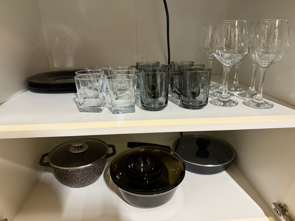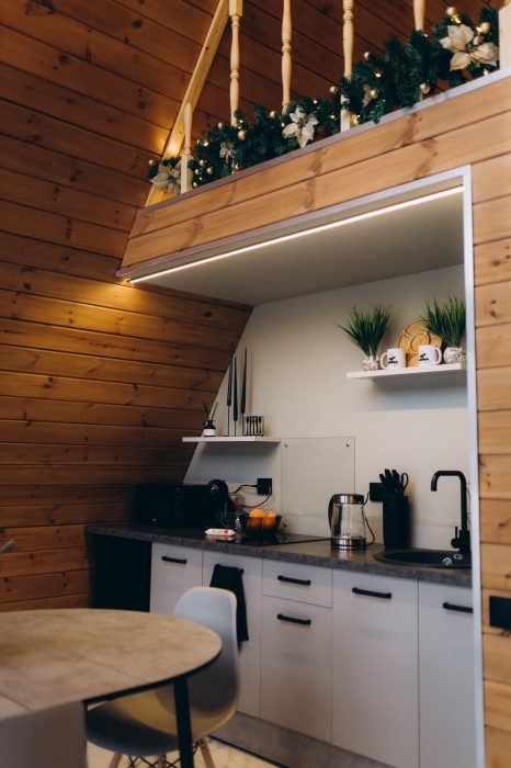 Кухня со всей необходимой посудой, чайник, микроволновка, капсульная кофеварка.