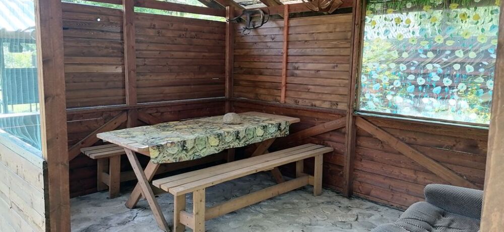 Столовая с камином и большим столом человек на 10, скамьи резные и стулья, с телевизором. Также, небольшая терраса под навесом.