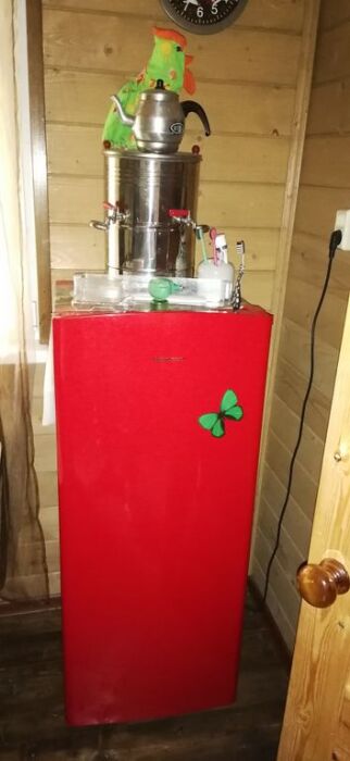 Кухня, холодильник, газовая плита, рукомойник с подогревом, кухонная утварь.