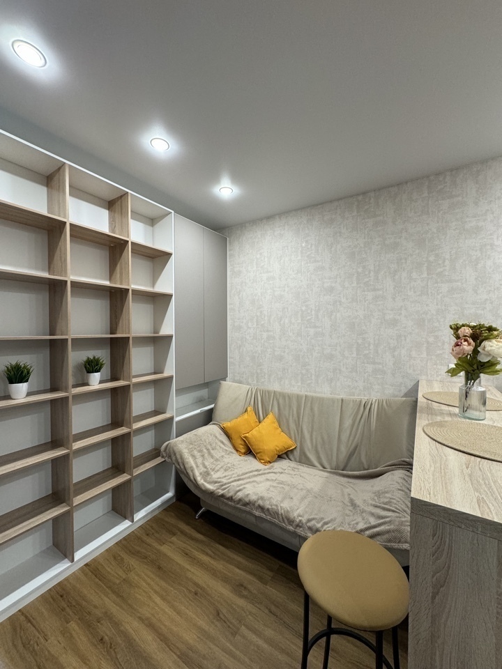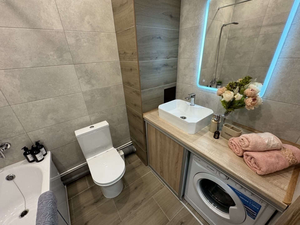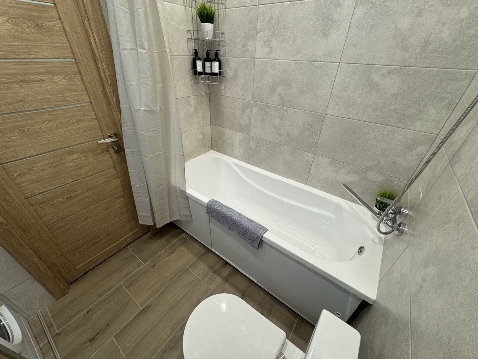Студия: 1 комната, 1 двуспальная кровать + 1 двуспальный диван. Будет комфортно разместиться 1-2 гостям или семье с ребёнком. Для вас готово свежее постельное бельё (100%-й хлопок) и полотенца. В квартире есть ванна.