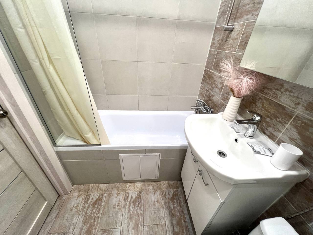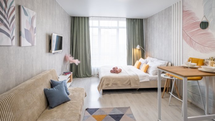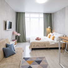 Студия: 1 комната, двуспальная кровать + 1 раскладной диван. Будет комфортно разместиться 2-4 гостям. Для Вас готово свежее постельное бельё (100%-й хлопок) и полотенца. В квартире есть ванна и балкон.