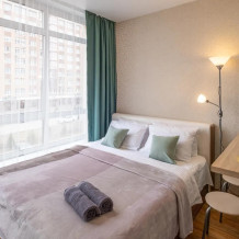 Студия: 1 двуспальная кровать + 1 раскладной диван. Для Вас готово свежее постельное бельё (100%-й хлопок) и полотенца. Душевая кабина. На этаже - балкон.