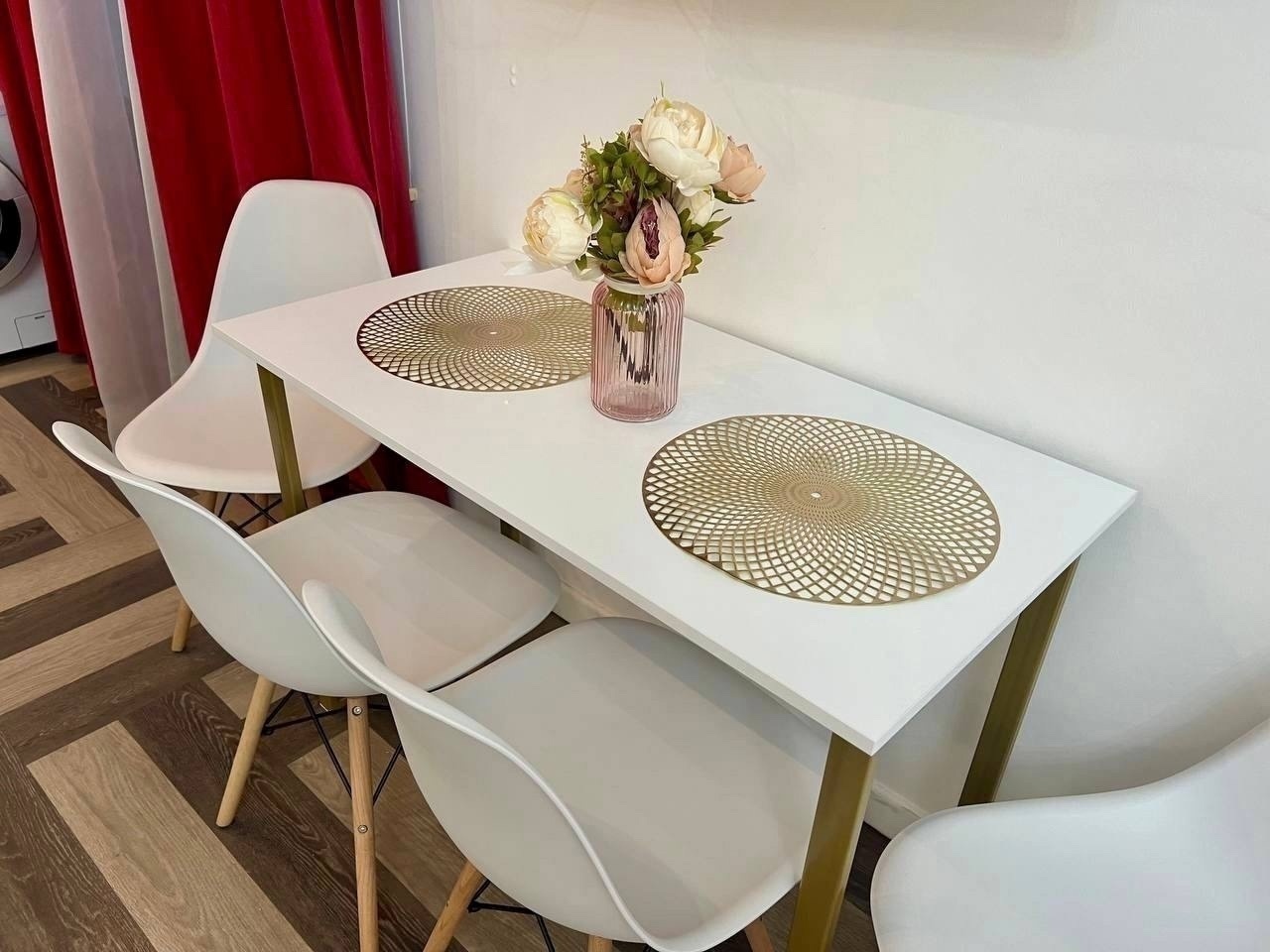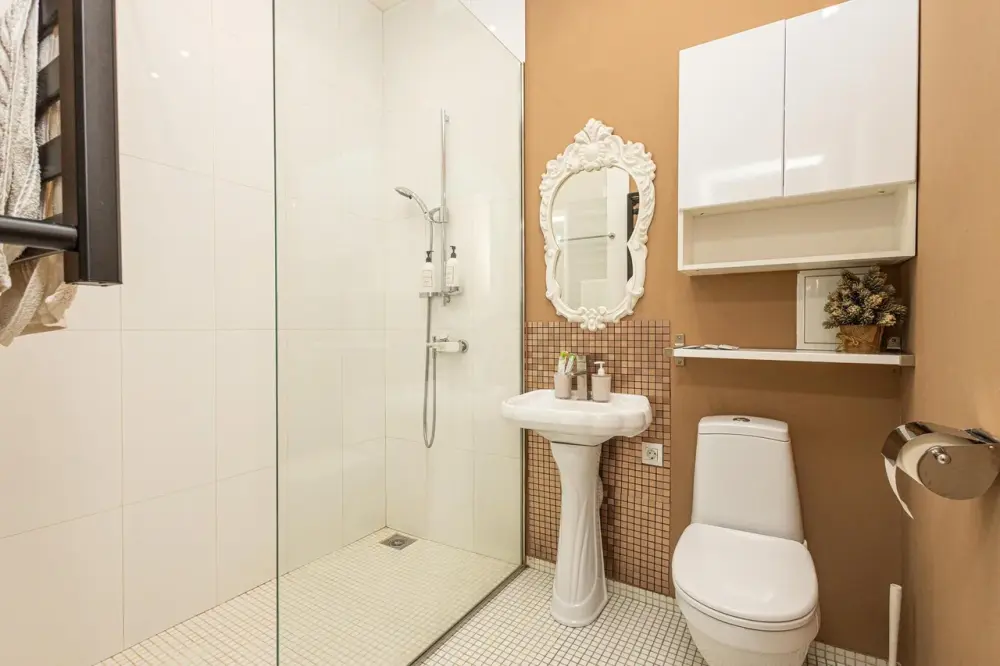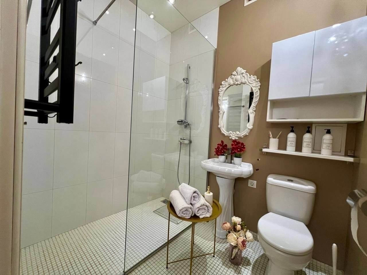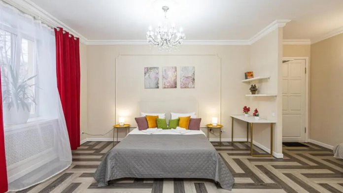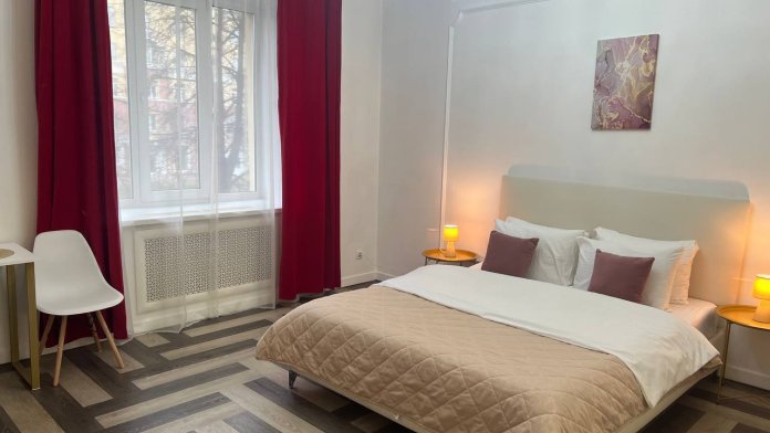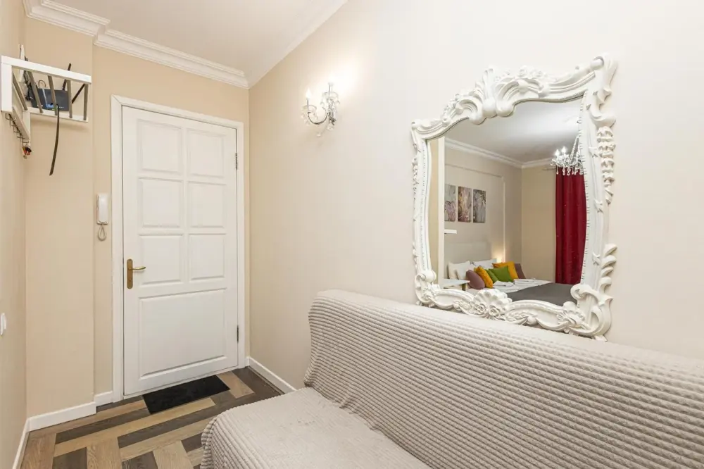 Студия: 1 комната, 1 двуспальная кровать + 1 раскладной диван. Будет комфортно разместиться 2-4 гостям. В квартире есть душевая кабина.