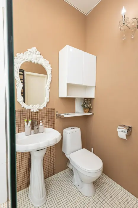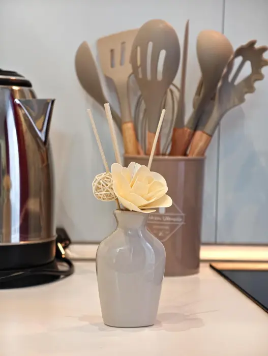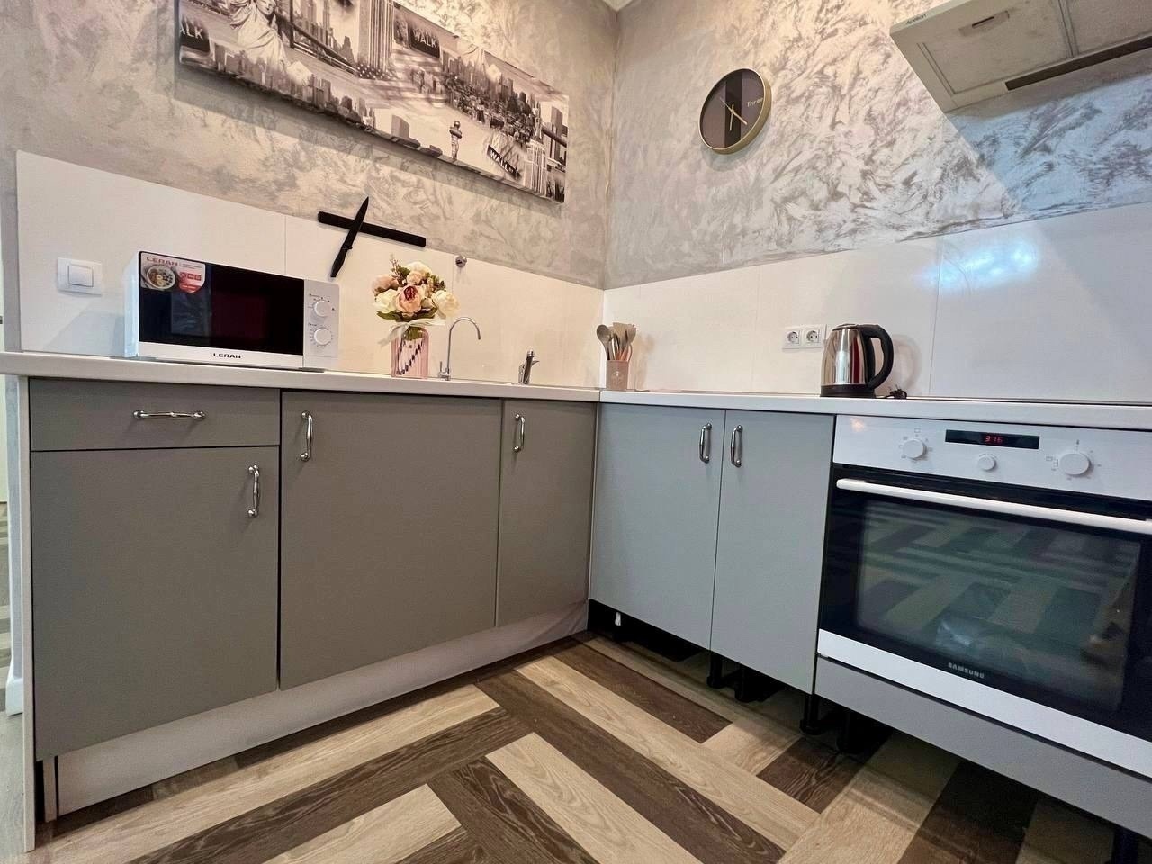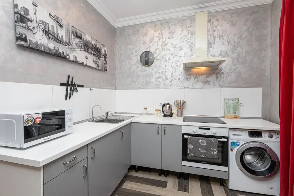 Техника: холодильник, чайник, плита, микроволновка, стиральная машина, утюг, фен. Есть всё для приготовления еды, а также сушилка и гладильная доска.