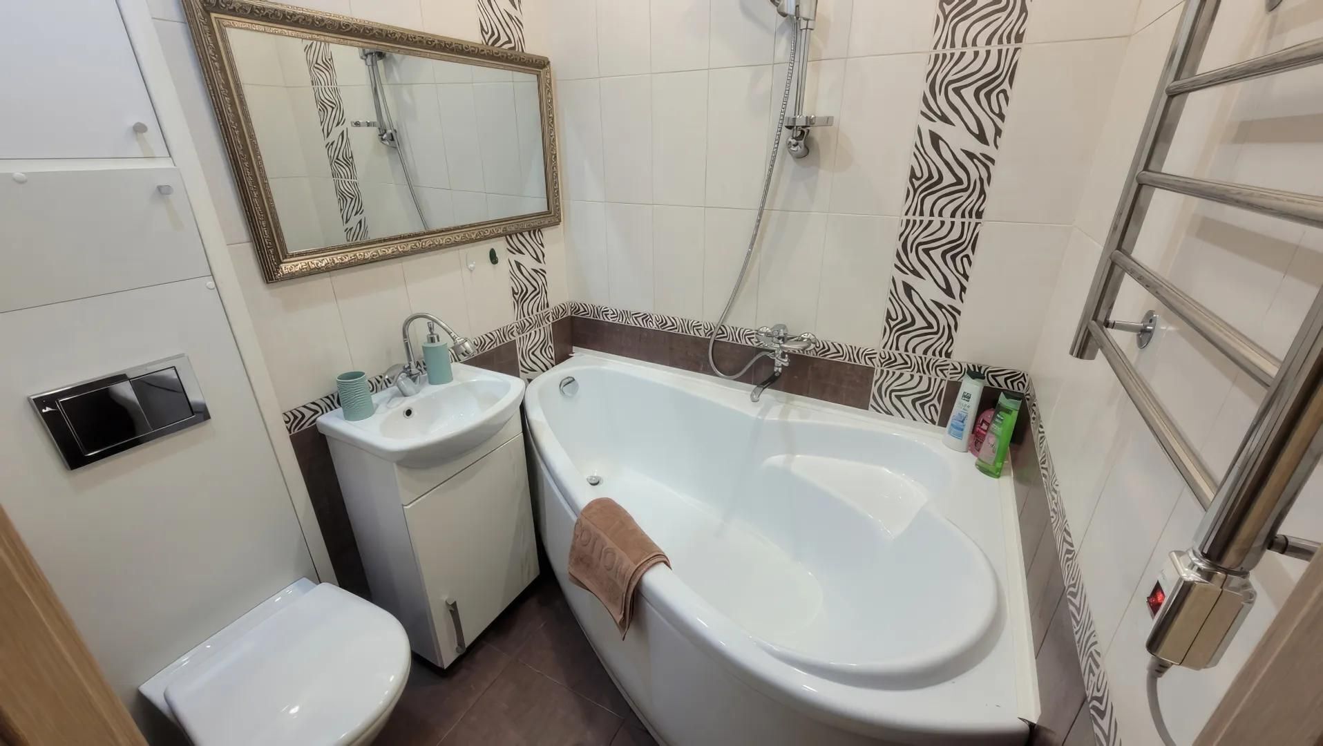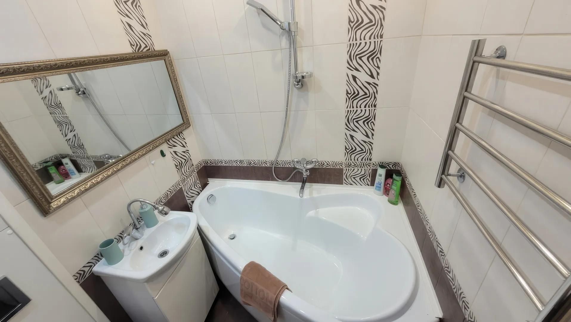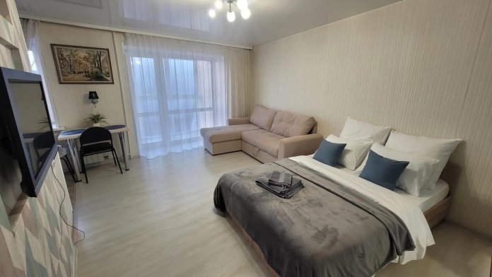 Квартира: 1 комната, 1 двуспальная кровать + 1 раскладной диван. Для Вас готово свежее постельное бельё (100%-й хлопок) и полотенца. В квартире есть большая угловая ванна. Балкон в квартире.