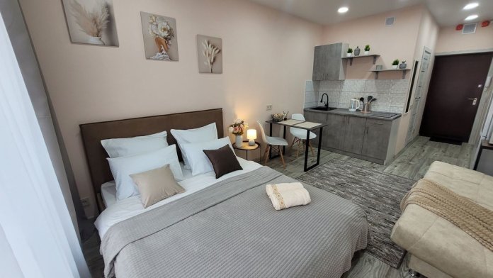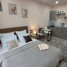 Студия: 1 комната, 1 двуспальная кровать + 1 раскладной диван. Для Вас готово свежее постельное бельё (100%-й хлопок) и полотенца. В квартире есть ванна. На этаже - балкон.