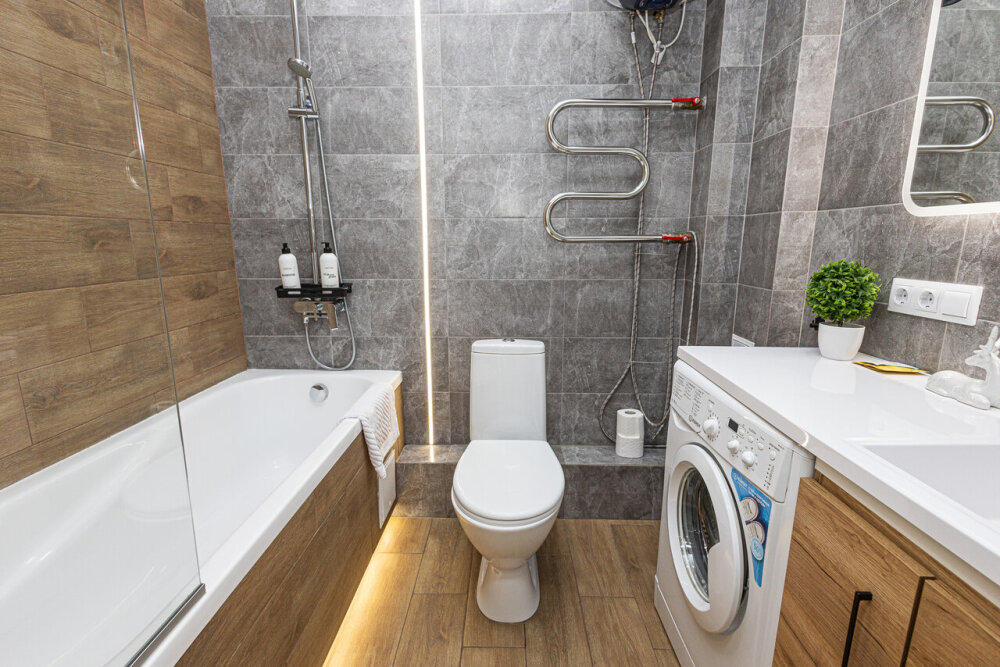 Техника: холодильник, чайник, плита, микроволновка, стиральная машина, утюг, фен, водонагреватель. Есть всё для приготовления еды, а также сушилка и гладильная доска.