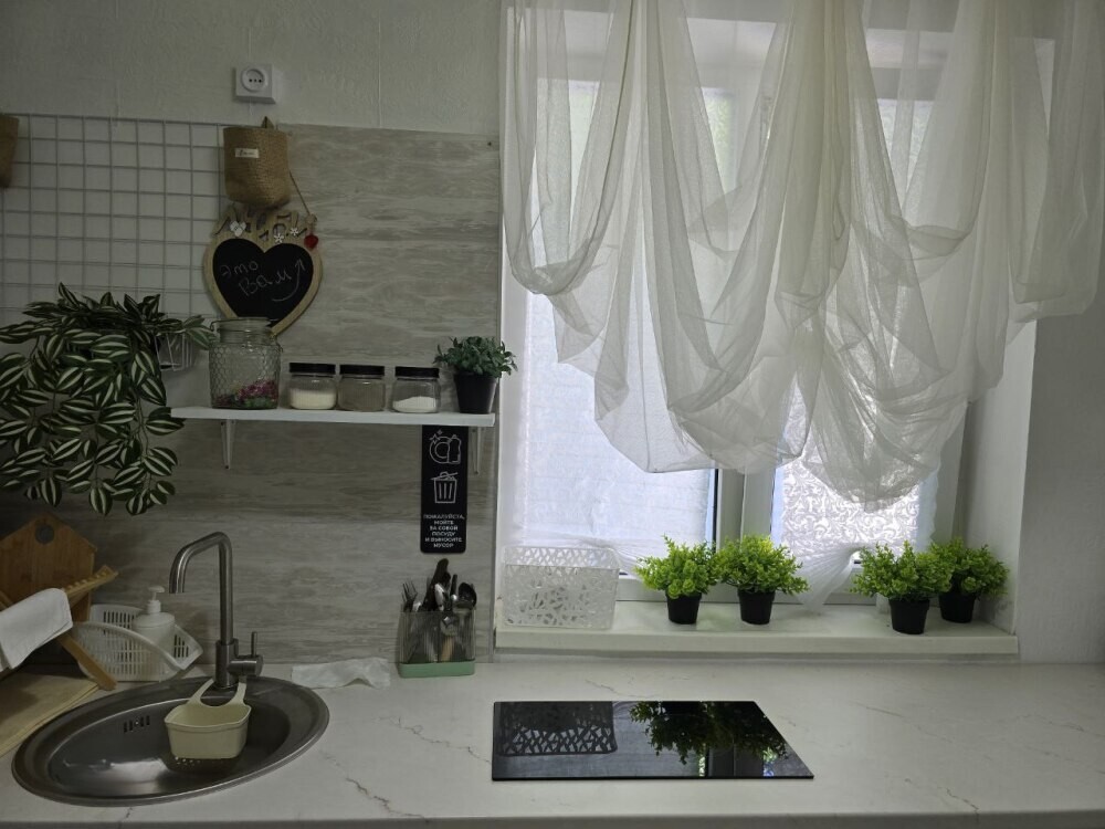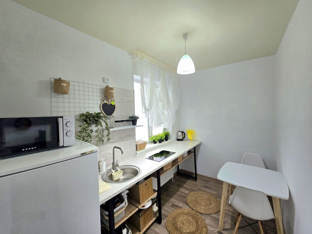 - современная кухня оборудована всей необходимой бытовой техникой (холодильник, микроволновая печь, индукционная плита, чайник), в ней также имеются посуда и столовые приборы;