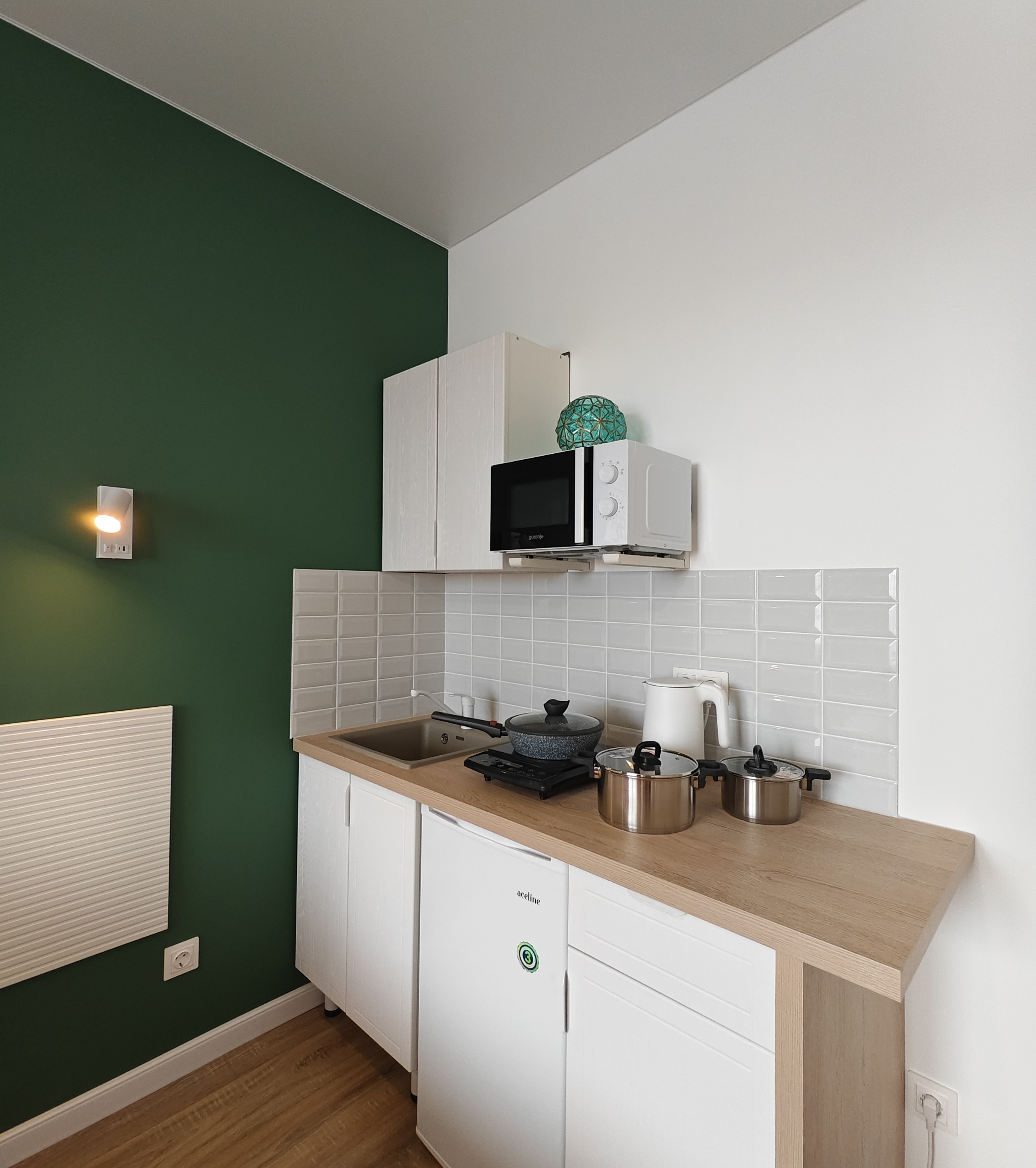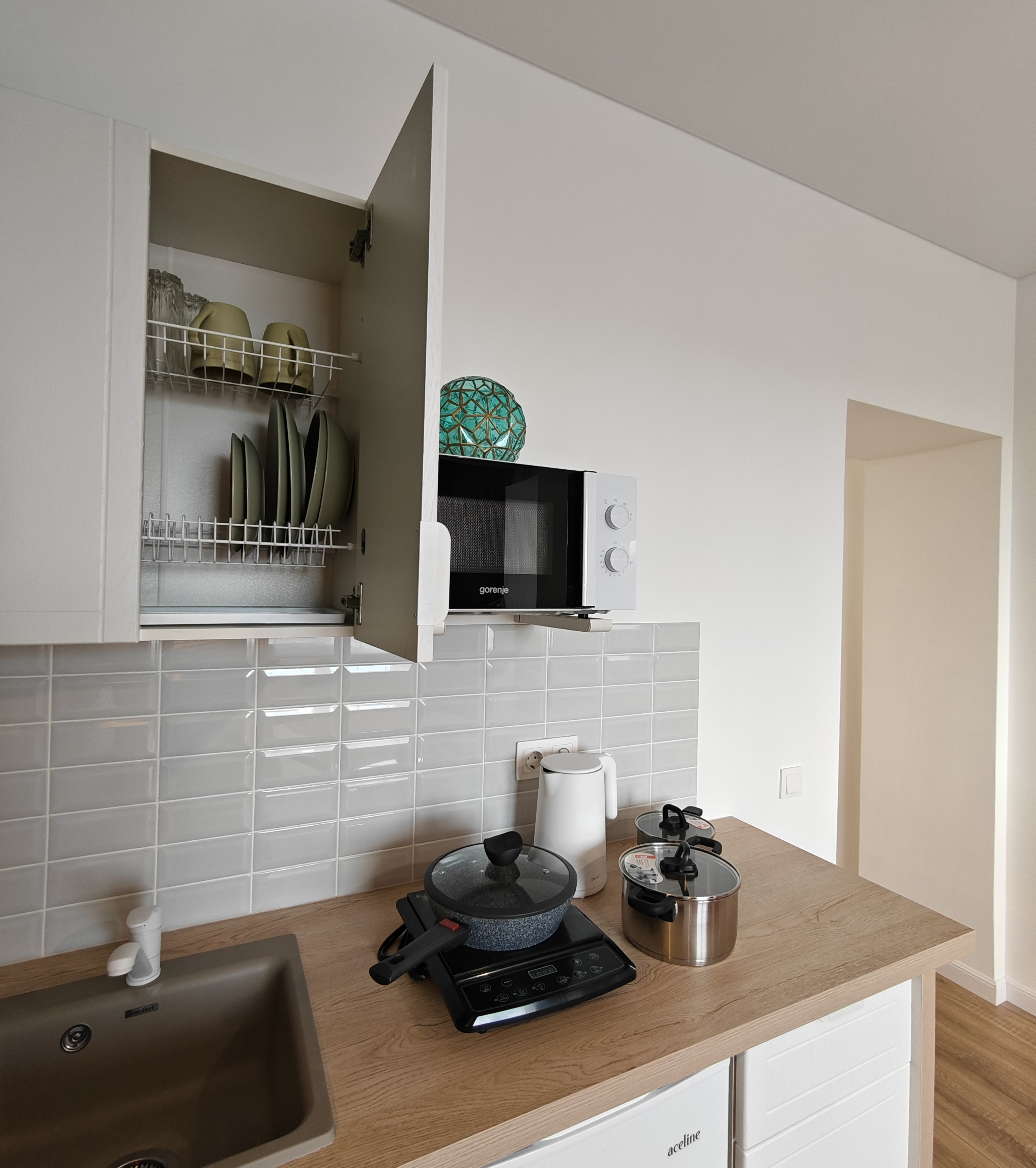 - холодильник, варочная панель, чайник, микроволновая печь, качественная посуда, фен;