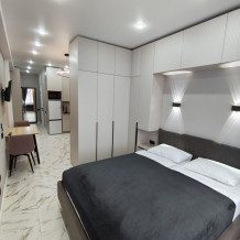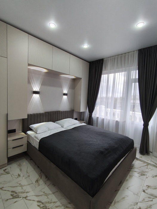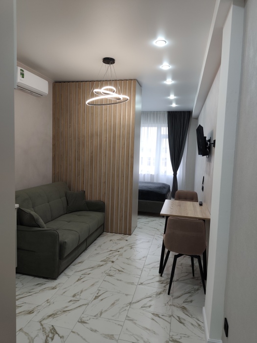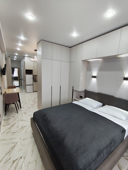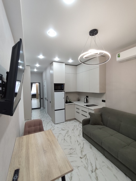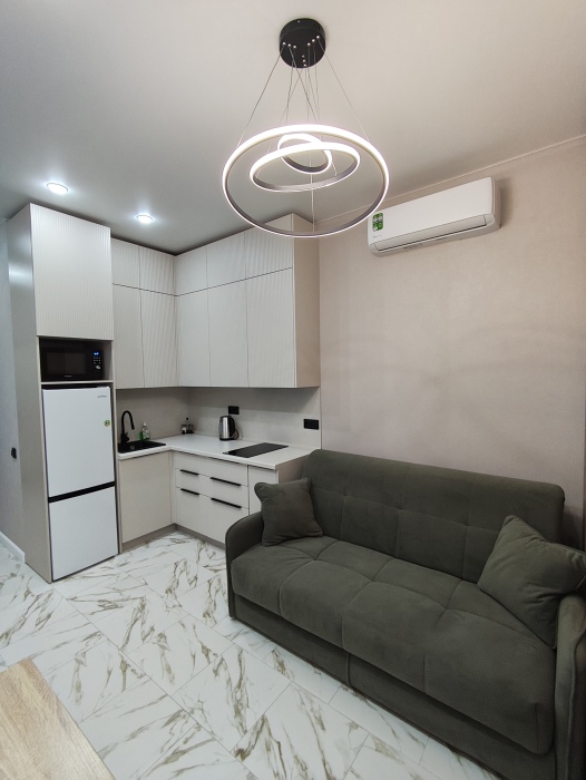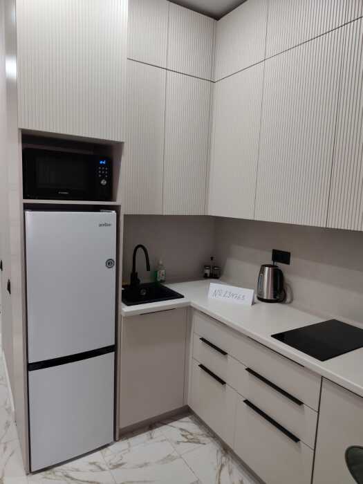 - Полностью оборудованная кухня: посуда, индукционная плита, холодильник с мoрoзильнoй кaмеpoй, микроволновка, электрический чайник.