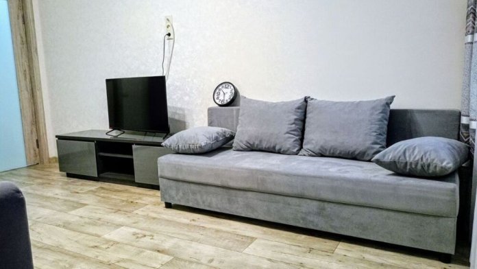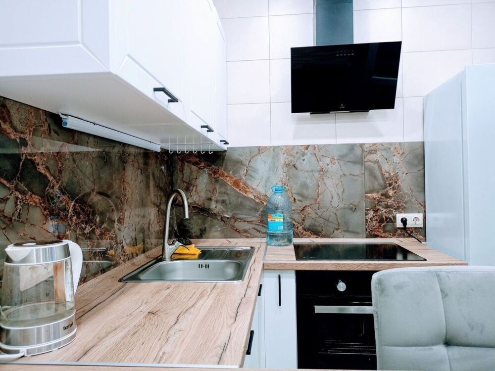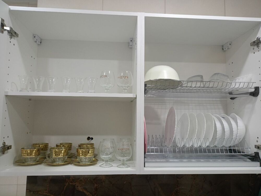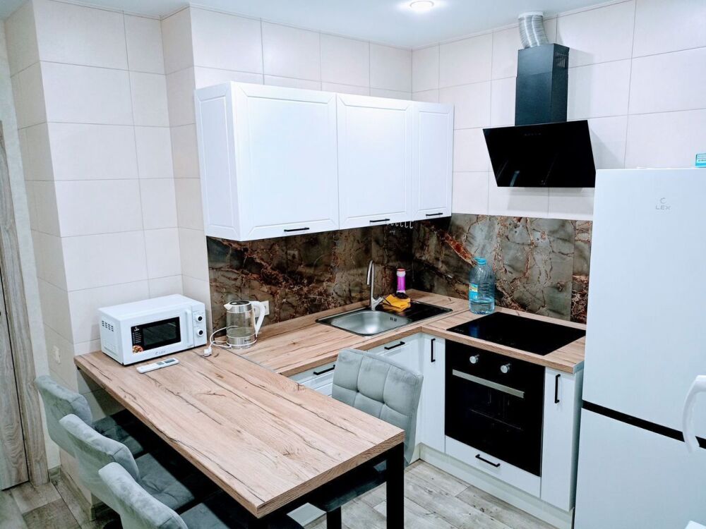 - оборудованная кухня со всем необходимым: варочная панель, духовой шкаф, микроволновая печь, вытяжка, электрический чайник, набор посуды для приготовления пищи (сковорода, кастрюля, а также приборы), посуда на 4 персоны и столовые приборы.