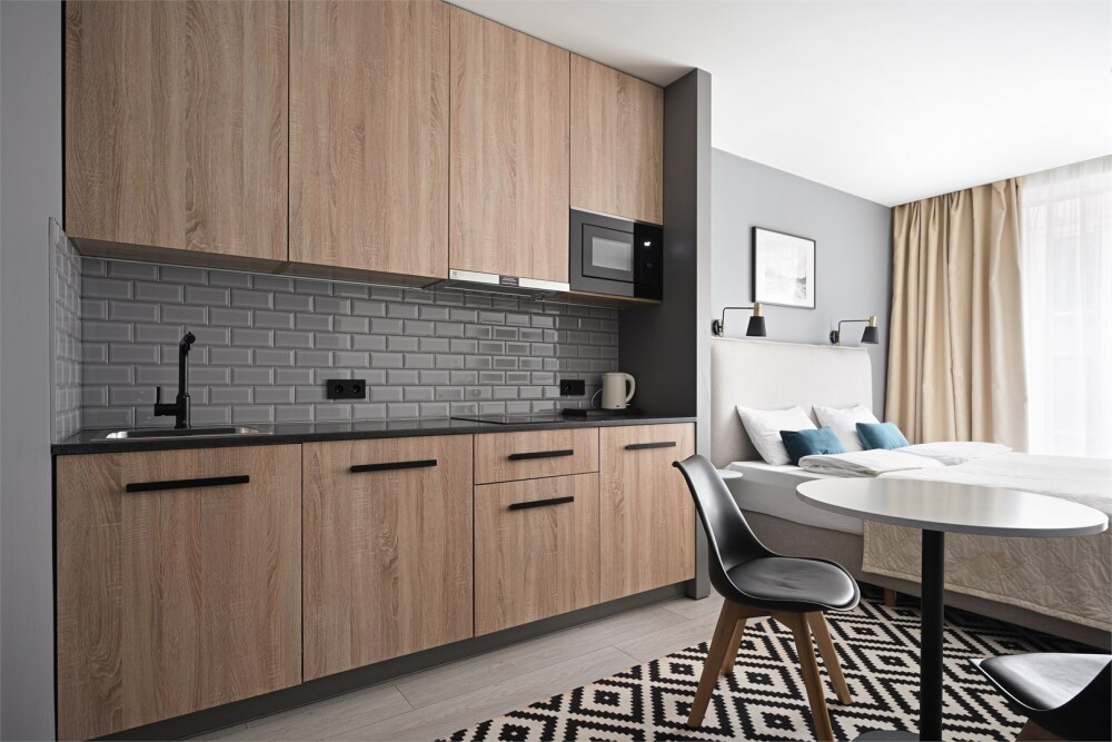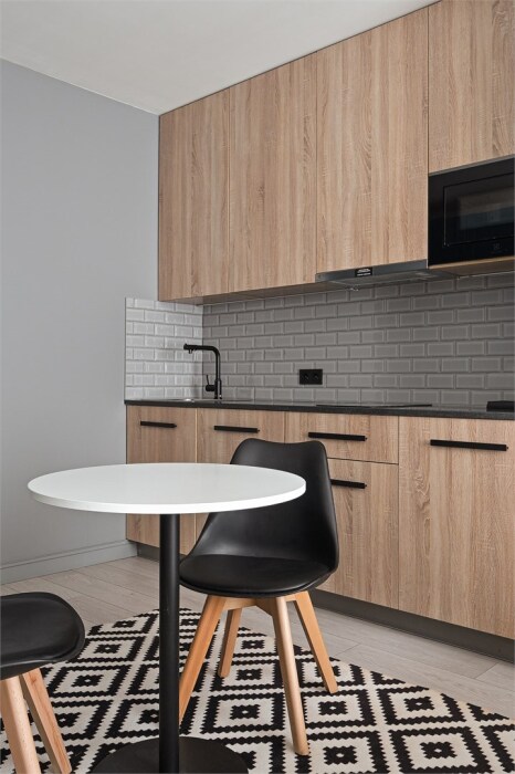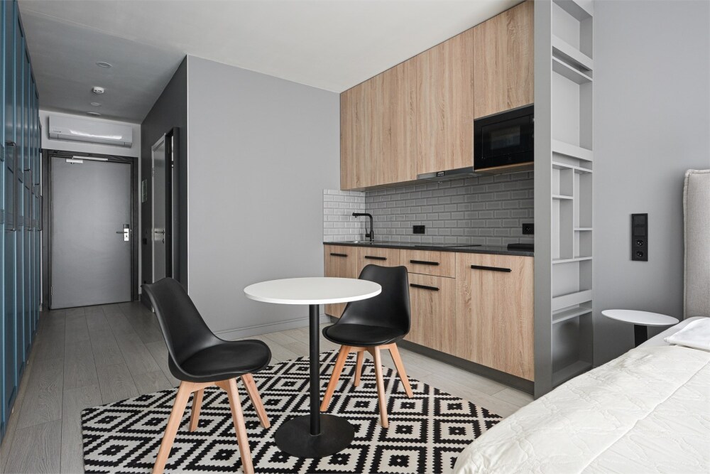 - Современный апарт-комплекс уровня 4 звезд с развитой инфраструктурой: круглосуточная охрана, коворкинг, магазин Вкусвилл, фудкорт, ресторан с камином.