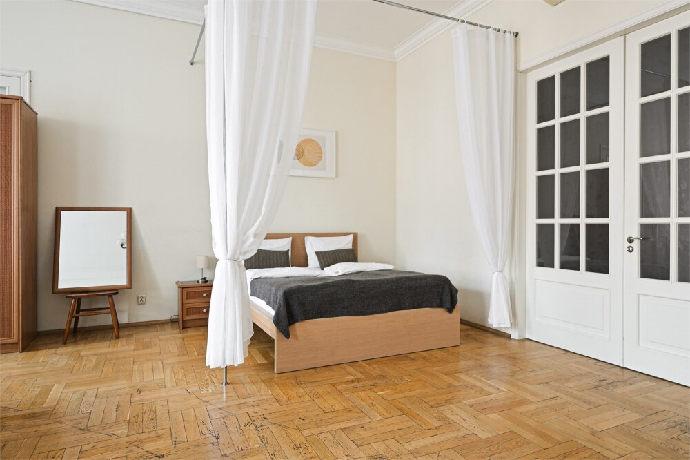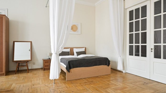 - Удобная двуспальная кровать шириной 160 см, диван и раскладушка в спальне.