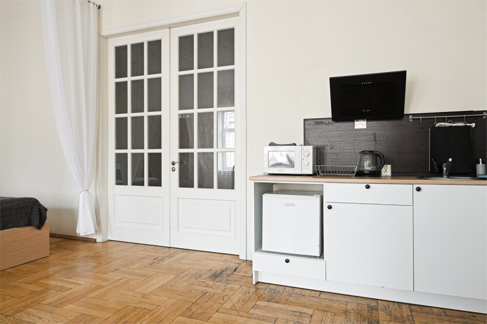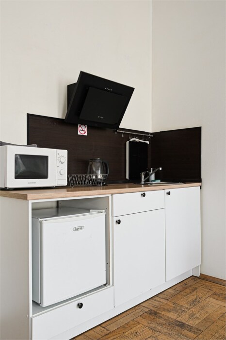 - Кухня: индукционная плита, чайник, холодильник.