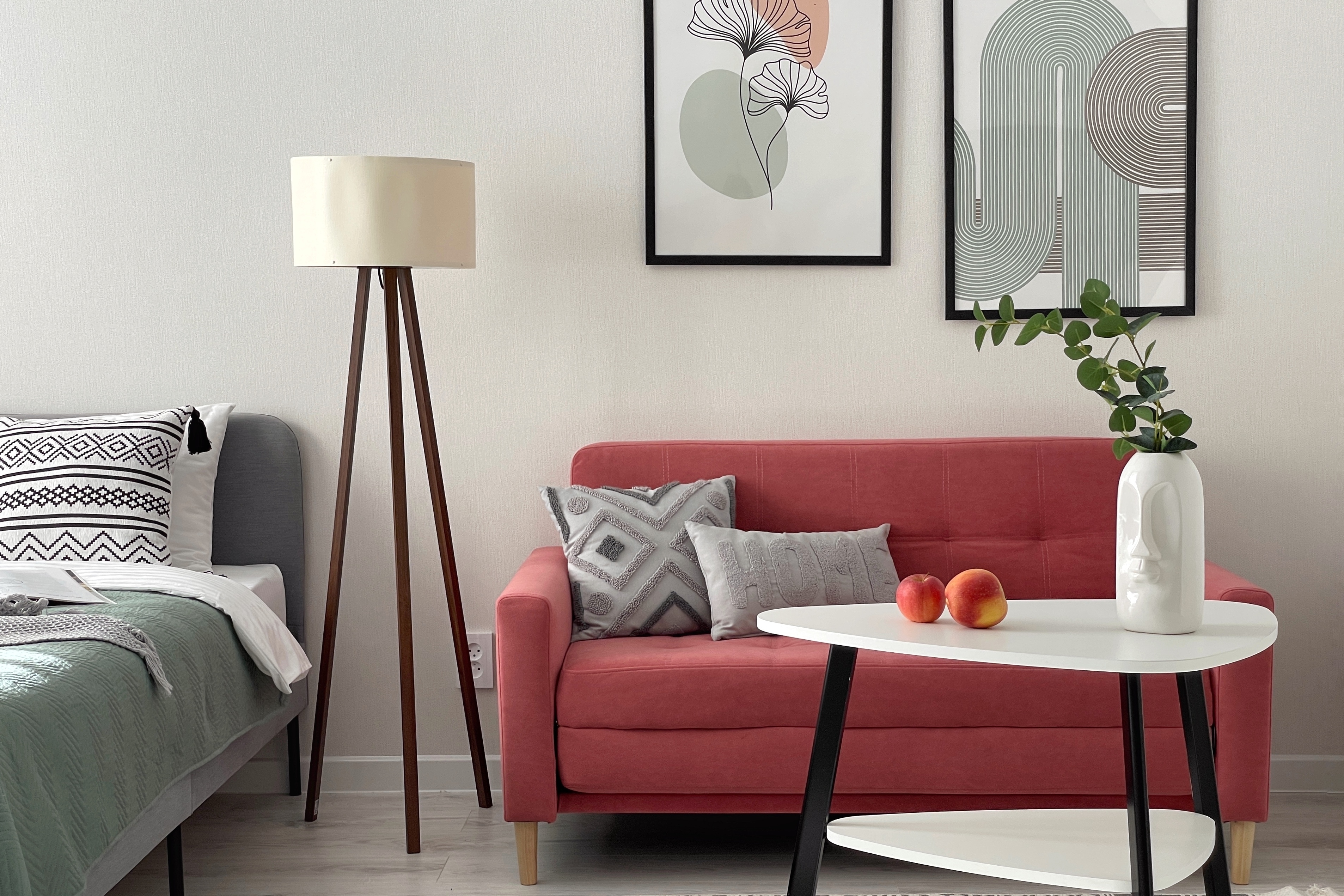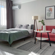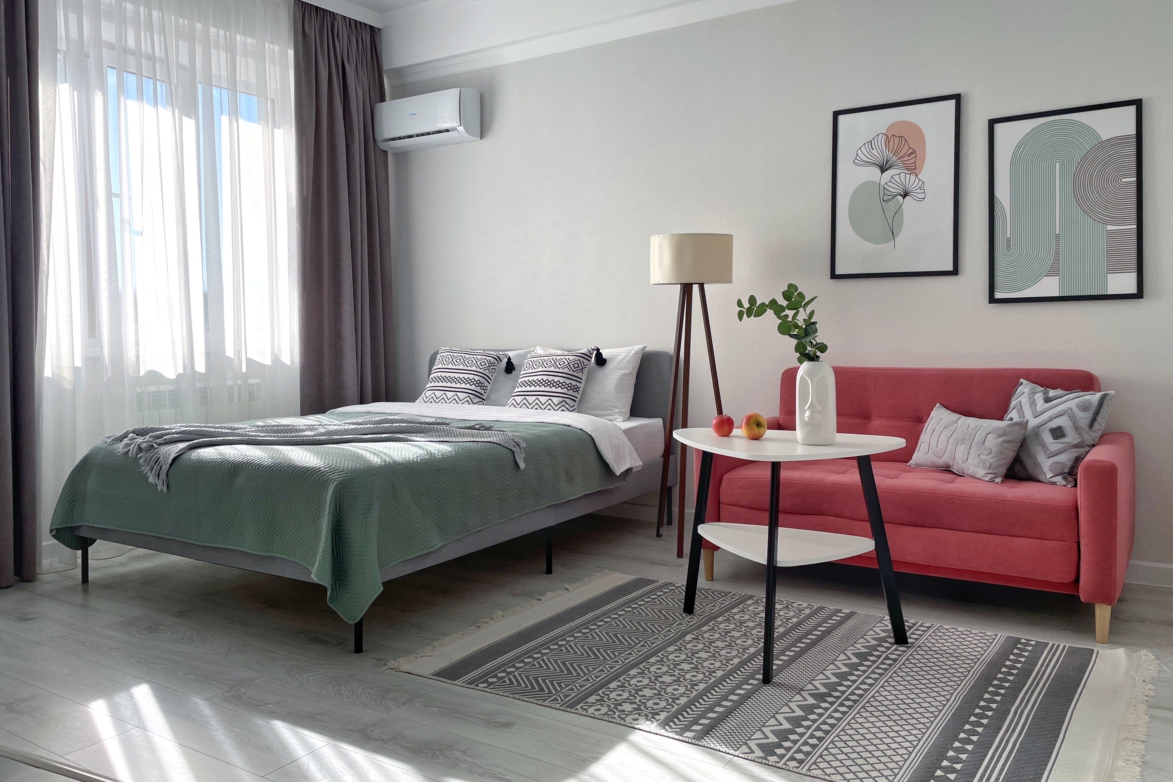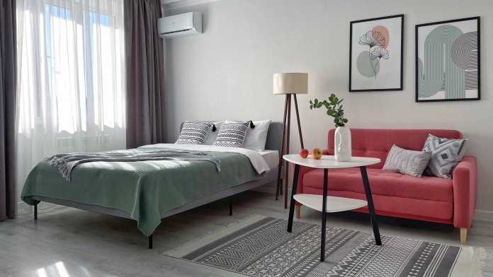 - Двуспальная кровать с качественным ортопедическим матрасом (160x200 см) и диван-кровать (120x200 см).
